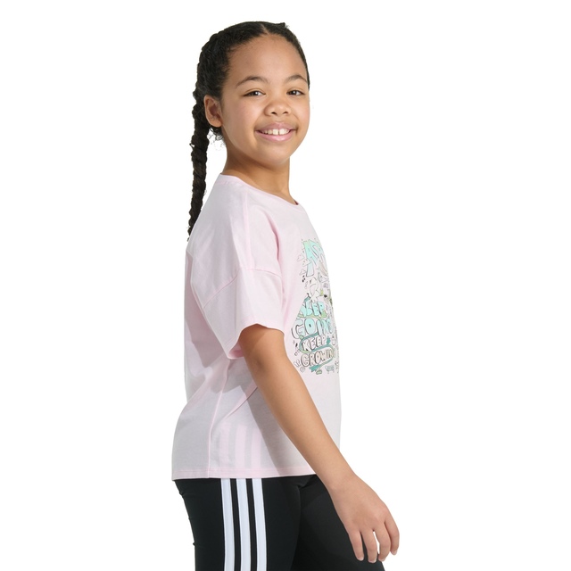 The adidas Kids' Drop Shoulder T-shirt combines casual comfort with a modern twist. Featuring a relaxed fit and dropped shoulders, this short-sleeve tee offers a laid-back look perfect for everyday wear. Bold screen-printed graphics add a unique touch.