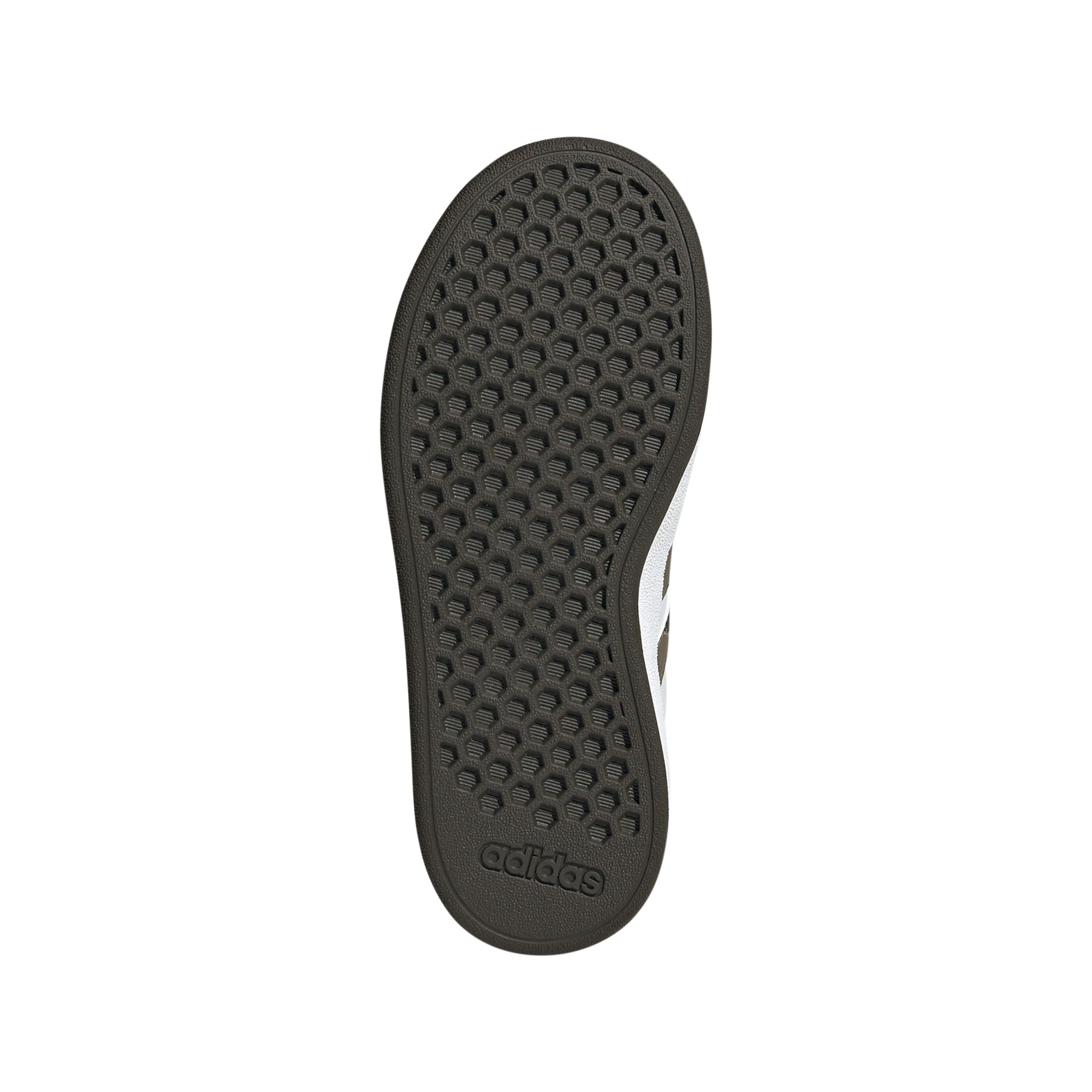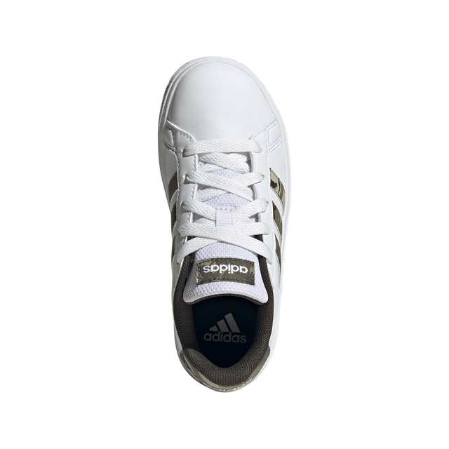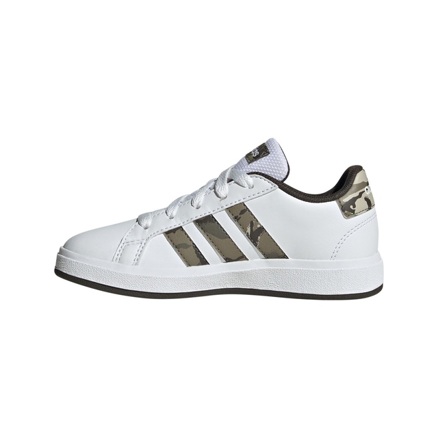 Prep for play or the school day in the adidas Kids' Grade/Pre-School Grand Court 2.0 Shoes. These lace-up adidas Grand Court sneakers with camo 3-Stripes inspire energy at every turn, whether racing to catch the bus or chasing friends across the playground. Synthetic leather is sleek and durable, and the rubber cupsole provides the right mix of comfort, support and traction to handle their fastest run-and-play moves. Made with at least 20% recycled materials, adidas helps to reduce waste and reliance on finite resources.