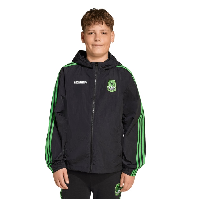 Building worlds or exploring your own, this adidas Kids' Minecraft Windbreaker Hoodie keeps you feeling good. It's part of a collaboration with adidas and Minecraft — a partnership celebrated with the 3-Stripes and pixelated graphics. The loose shape lends a casual look and feel.