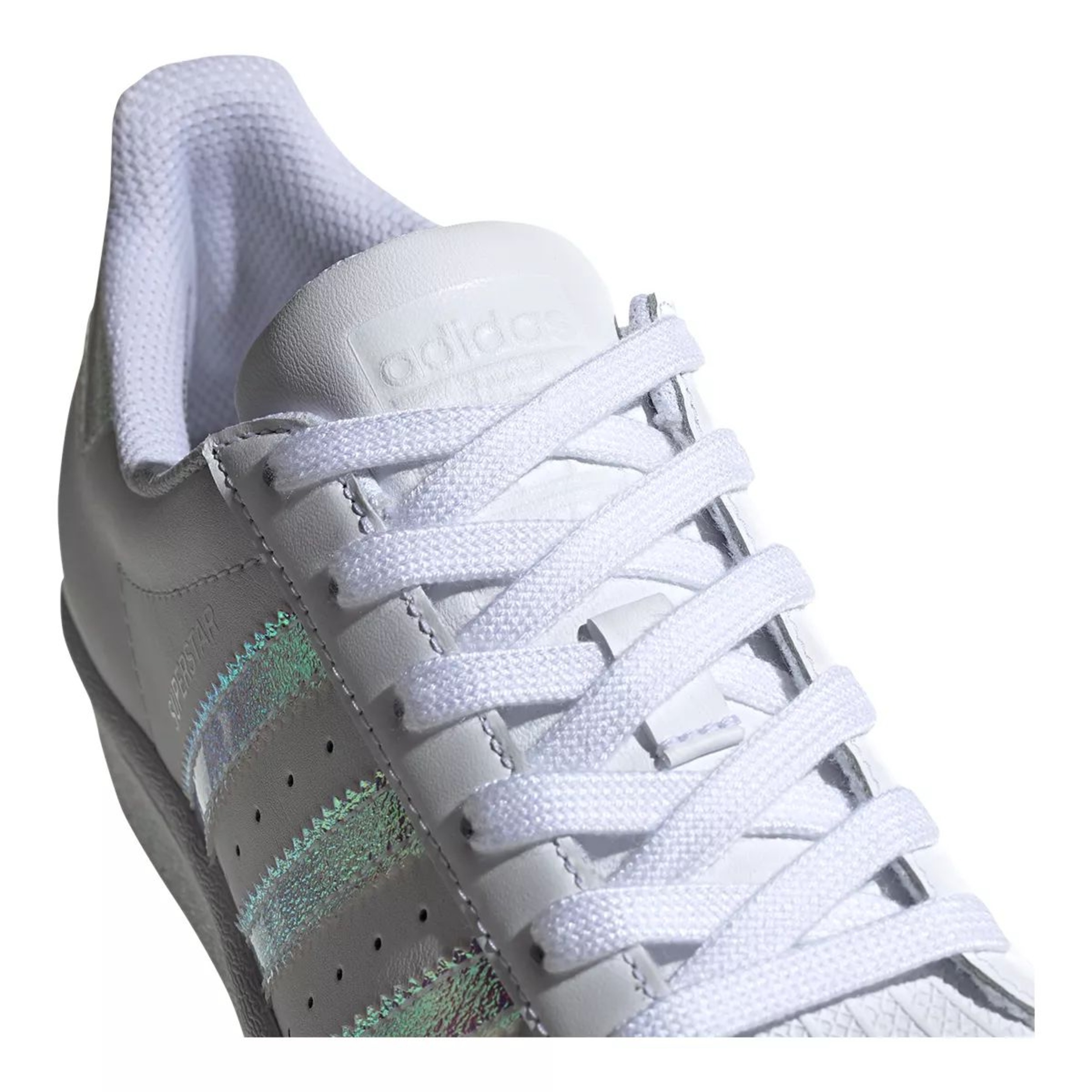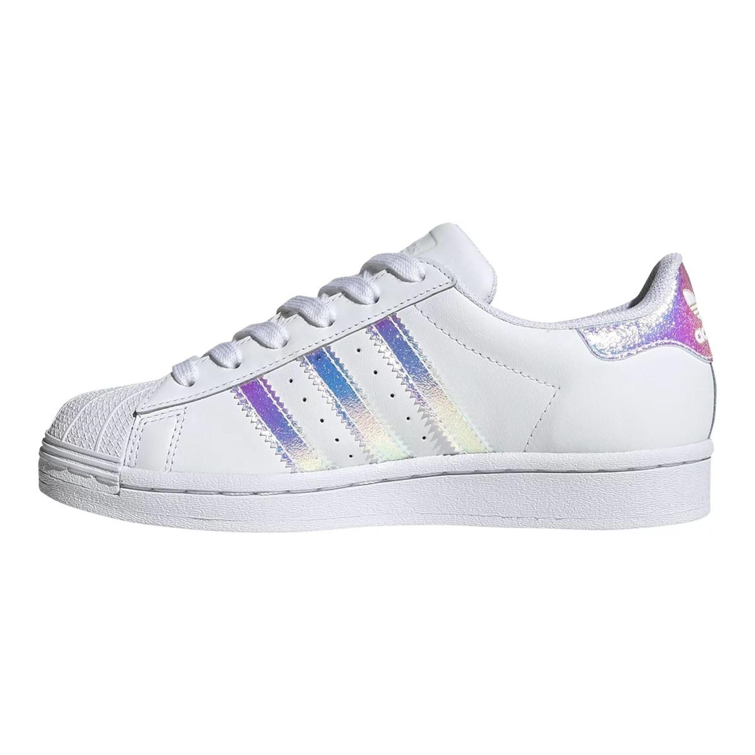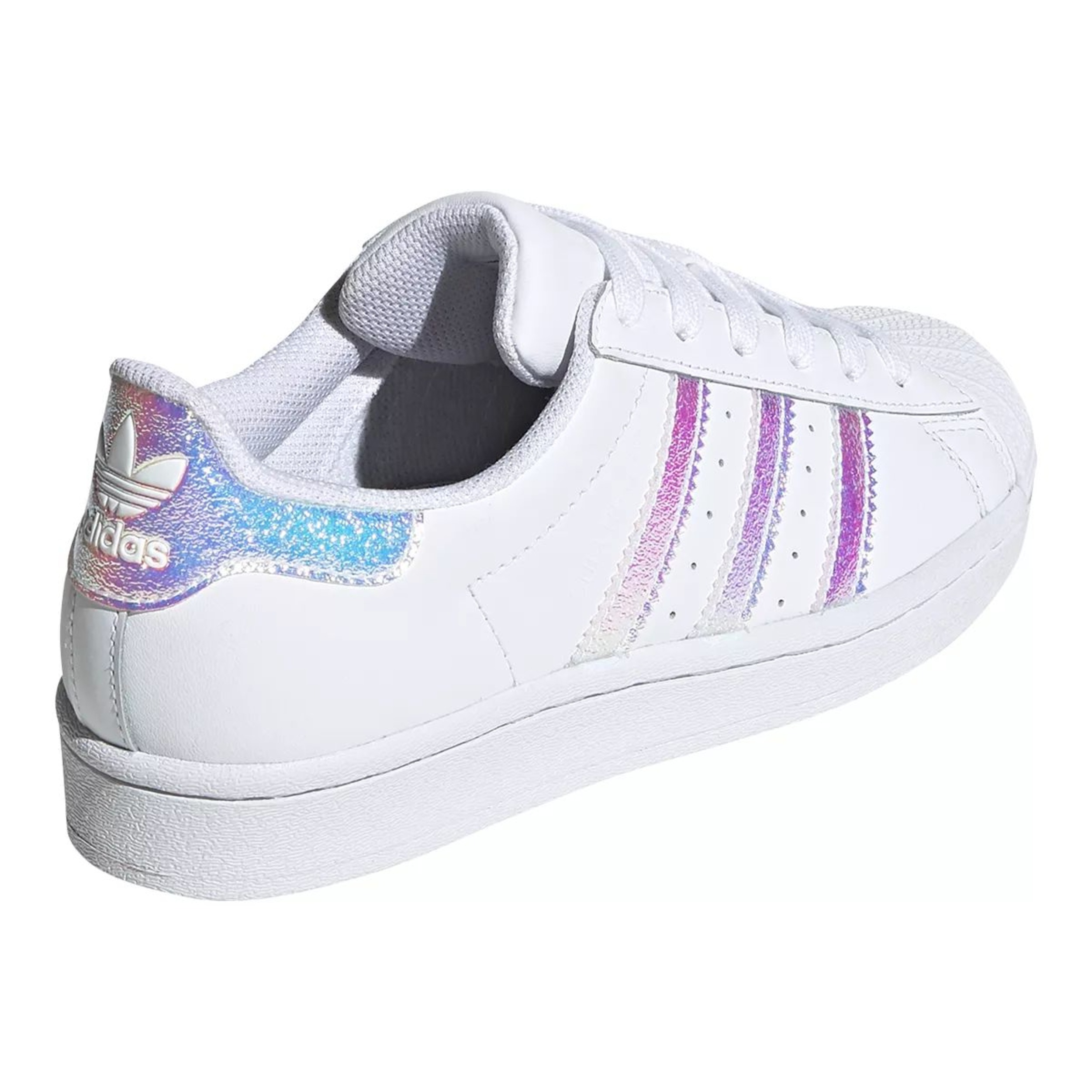 The adidas Superstar trainer came to play. Fifty years later, it's still on top. These juniors' shoes show off a flashy new look with iridescent 3-Stripes and heel tabs on the leather upper. They're capped off with an iconic rubber shell toe.