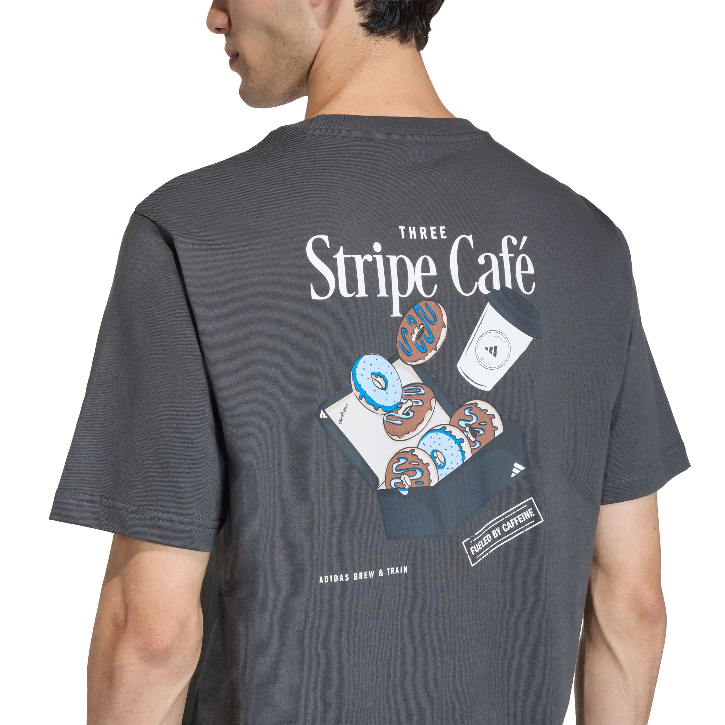 Get your fill of casual adidas style at the 3-Stripes Café. This Coffee Café Donut Box graphic t-shirt shows off a fun graphic on the back, bringing a touch of whimsy to your wardrobe. Made from single jersey, it offers a soft and breathable feel, helping you stay comfortable throughout the day. The crewneck collar, meanwhile, brings classic t-shirt vibes. Whether you're grabbing a brew or snacking with friends, this eye-catching adidas t-shirt is your go-to choice for effortless style.