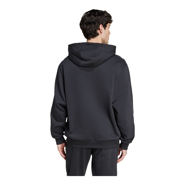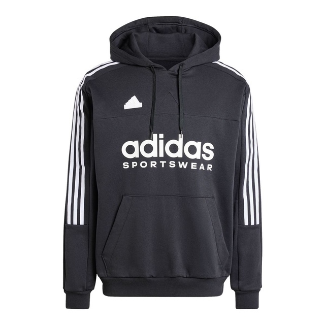 The adidas Men's Sportswear Tiro Pullover Hoodie blends athletic and casual styles. Made from a 70% cotton and 30% recycled polyester fleece blend, this relaxed-fit pullover offers comfort. With a kangaroo pocket, three-stripe detailing, and graphic details, this pullover hoodie creates a stylish look for an active lifestyle.