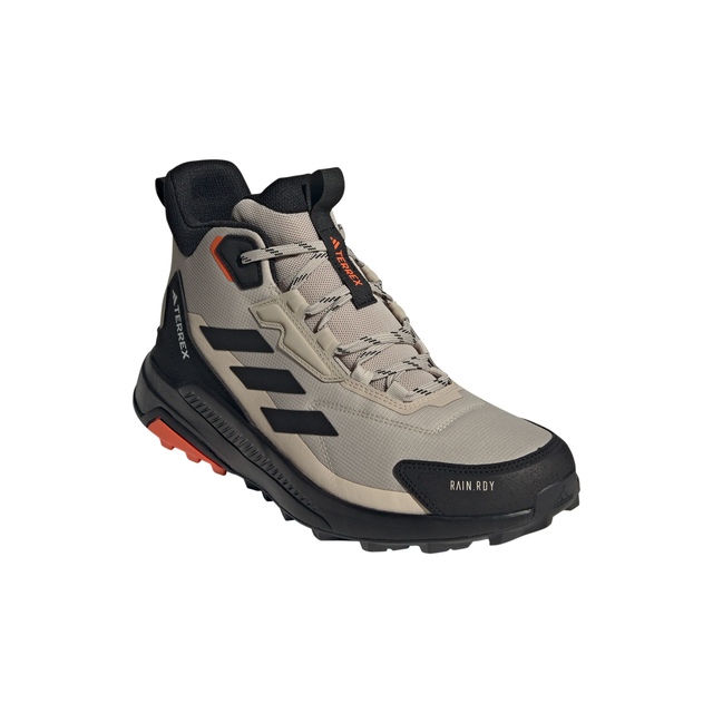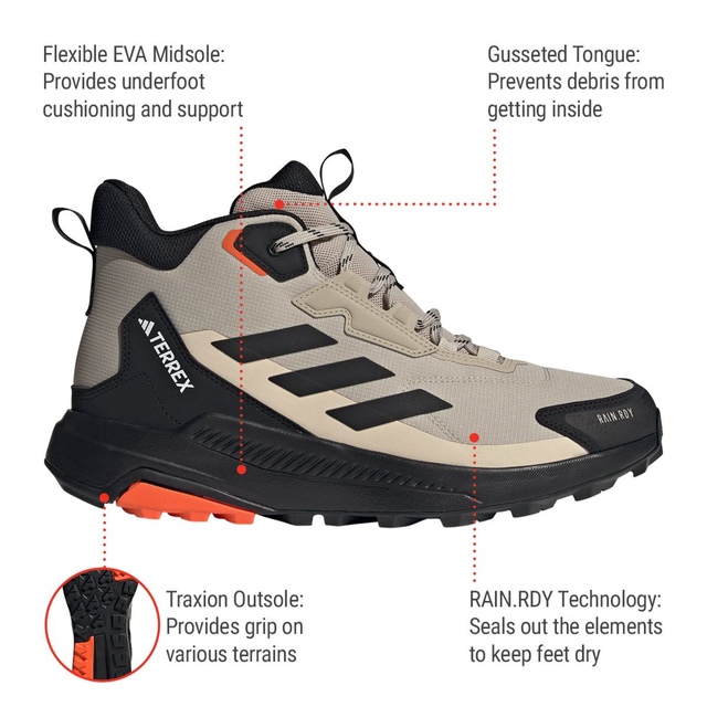 Wander. Roam. Explore. Lace up these adidas Terrex hiking shoes and explore high and low, wet or dry. A mid-height cuff offers ankle support, and a cushioned midsole delivers lasting comfort. RAIN.RDY works with a gusseted tongue to seal out the elements, keeping your feet dry and comfortable in wet conditions. Built for durability over the long haul, they feature a Traxion outsole for a sure-footed grip. By choosing recycled, Adidas are able to reuse materials that have already been created, which helps to reduce waste. Renewable materials choices will help us to remove its reliance on finite resources. Adidas products made with a blend of recycled and renewable materials feature at least 20% total of these materials.