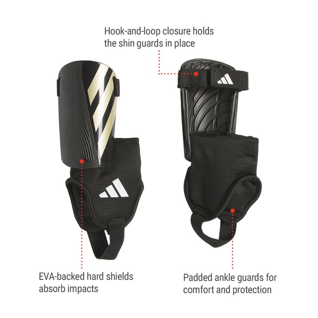 Commit to your game without worrying about your rivals. Built for young players on the rise, these juniors' adidas Tiro Match shin guards boost your coverage with EVA-backed hard shields and padded ankle guards. A hook-and-loop closure keeps everything in place so you can focus on getting the win. Made with at least 20% recycled content to avoid the larger environmental impact of producing virgin content.