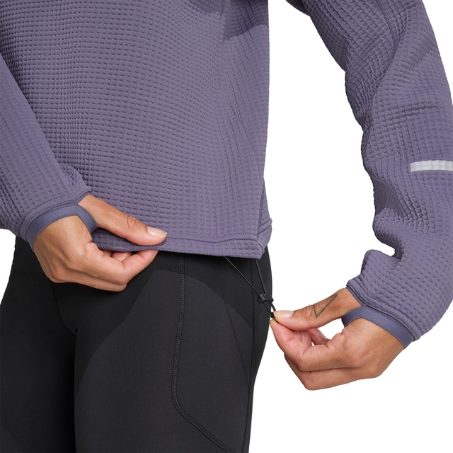 Stay comfortable on your run with the adidas Women's Run Adi365 Sweatshirt. Designed for year-round use, it features CLIMAWARM+ technology to keep you warm without adding bulk. The waffle structure fabric helps with body temperature regulation, while thumbholes provide extra warmth for your hands.