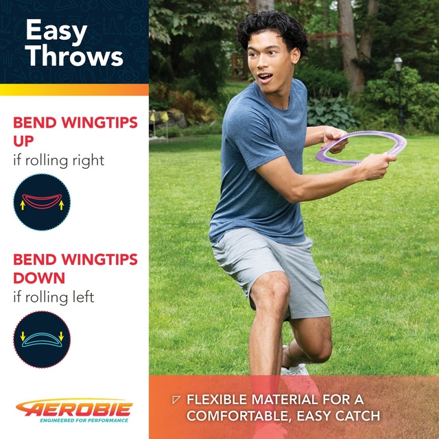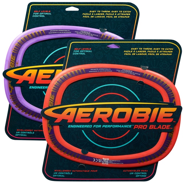 Get ready, get set, and throw for incredible flying performance with the Aerobie™ Pro Blade Self-Leveling Throw Ring. Made for both right and left-handed throwers, these are the easiest rings to throw and catch with innovative technology that allows the ring to self-level as it rotates in the air. They are the perfect throwing toy for exhilarating flying disc games such as ultimate frisbee, disc golf, or basic outdoor freestyle play. Additionally, Pro Blades are easier and more comfortable to catch because of their easy-to-hold ring-like shape. The throw ring's open center provides players with the ability to experiment with customizing their throwing and catching styles and create their own fun outdoor games to play with family and friends. This Pro Blade is available in both the colour red and purple, it measures 14" x 10.5", and is recommended for ages five and up.