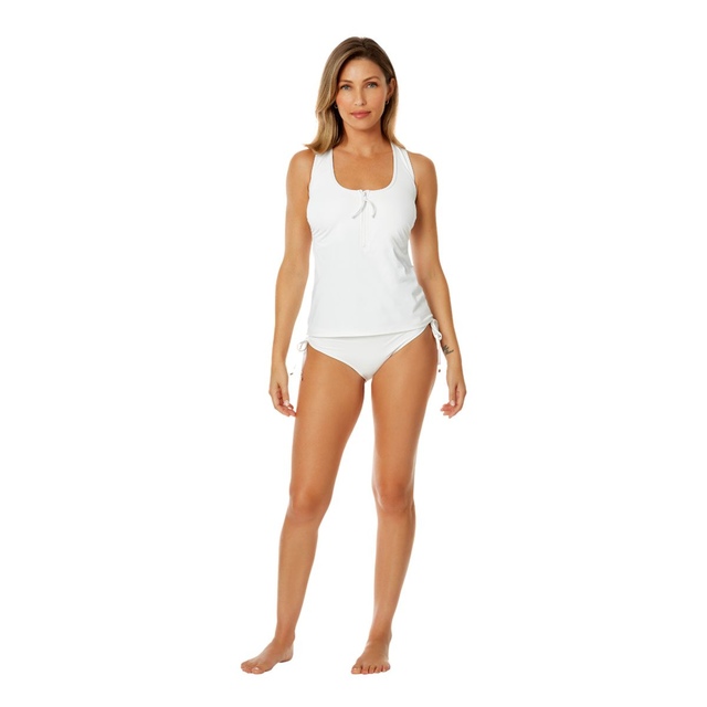 This Anne Cole tankini top provides both style and comfort for active women. The functional half zip front and racerback design allow a full range of motion while the removable soft cups provide customizable support. Pair the flattering scoop neck tank with your choice of bottoms to achieve a stylish, sophisticated or sporty look. Contrast binding adds eye-catching detail. This versatile top transitions seamlessly from poolside lounging to aqua aerobics, letting you focus on fun not function. The racerback straps stay securely in place even during vigorous activity while the half zip provides customizable coverage and ventilation. Feel confident and look great in this Anne Cole tankini.