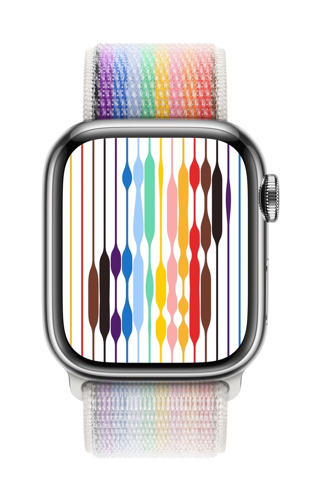 The Apple Watch 41mm Pride Edition Sport Loop Wristband is eco-friendly and vibrant. It is made from 82% recycled yarn, including repurposed fishing nets, and features a breathable double-layer weave. The adjustable hook-and-loop fastener fits wrists 130-200mm. Its rainbow gradient pattern celebrates LGBTQ+ communities of colour and those impacted by HIV/AIDS. This Pride Edition wristband combines comfort with meaningful design.