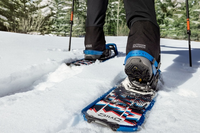 Packflat® Binding tech allows the snowshoes to fold flat for easy transporting