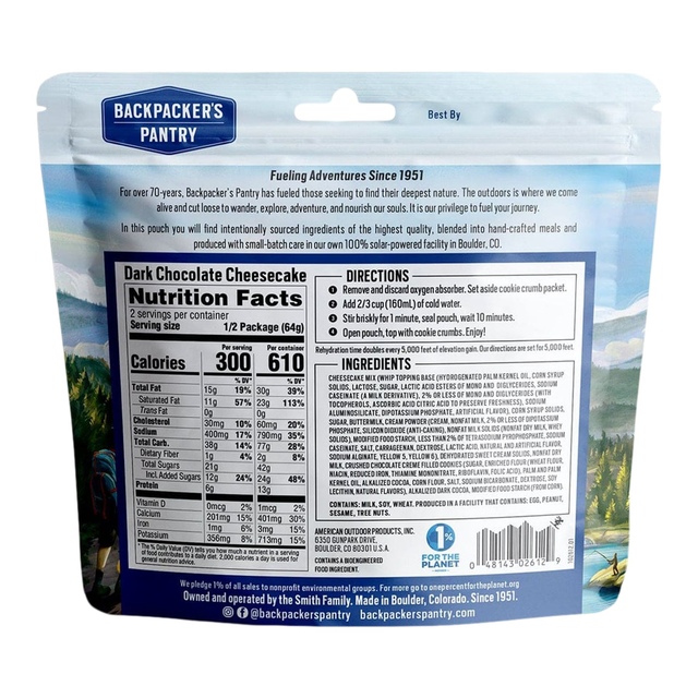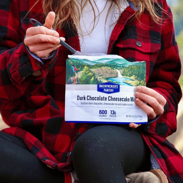 Indulge in Backpacker's Pantry Chocolate Cheesecake, a vegetarian delight featuring decadent imported dark chocolate and rich cheesecake topped with chocolate cookie crumbs. Perfect for the adventurous spirit, this freeze-dried dessert offers 610 calories and 13g of protein per pouch, with a 10-year shelf life. This tasty Backpacker’s Pantry cheesecake is a delicious way to cap off a day in the wild.