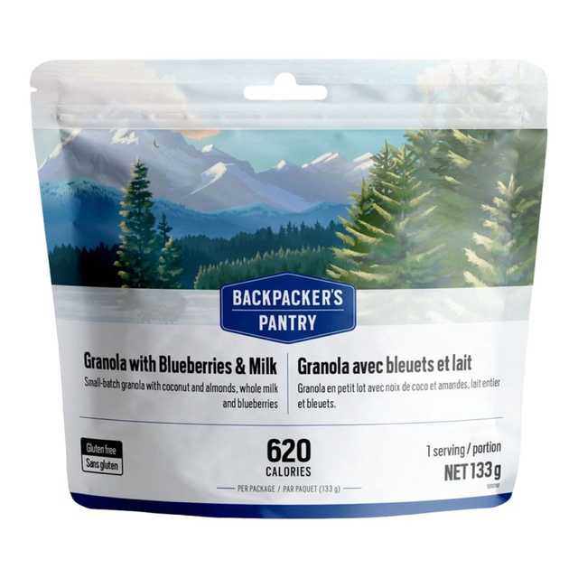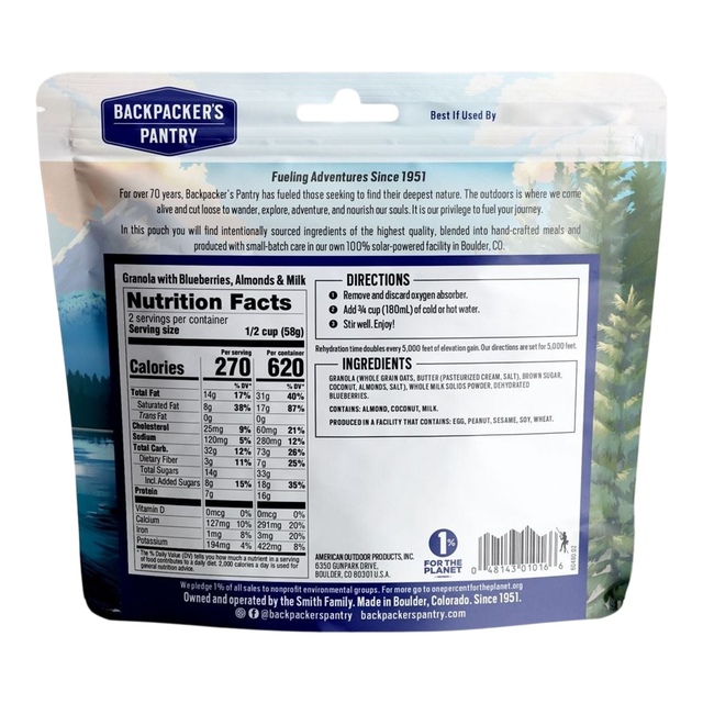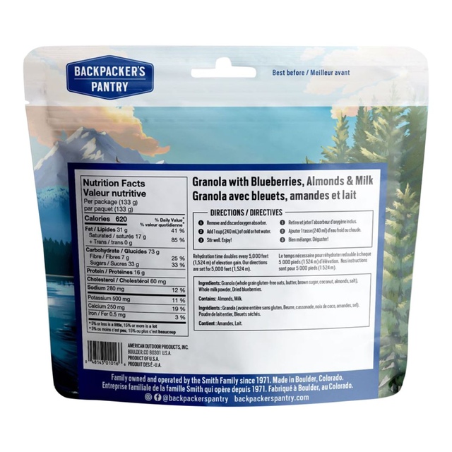 This Backpacker's Pantry Granola with Almonds and Milk is the perfect way to start your day in the great outdoors. This breakfast granola includes oats, rich butter, sweet brown sugar, coconut, crunchy almonds with milk powder and blueberries to offer a hearty and delicious first meal of the day. Simply add water to this easy-to-make Backpacker's Pantry granola, stir and enjoy.