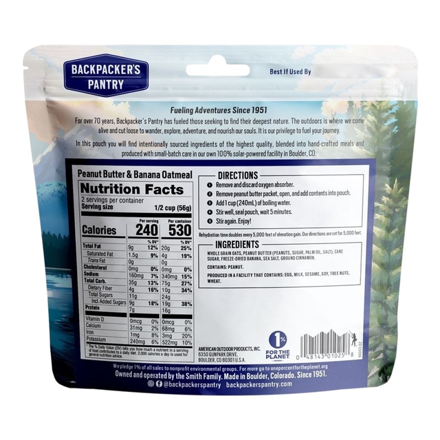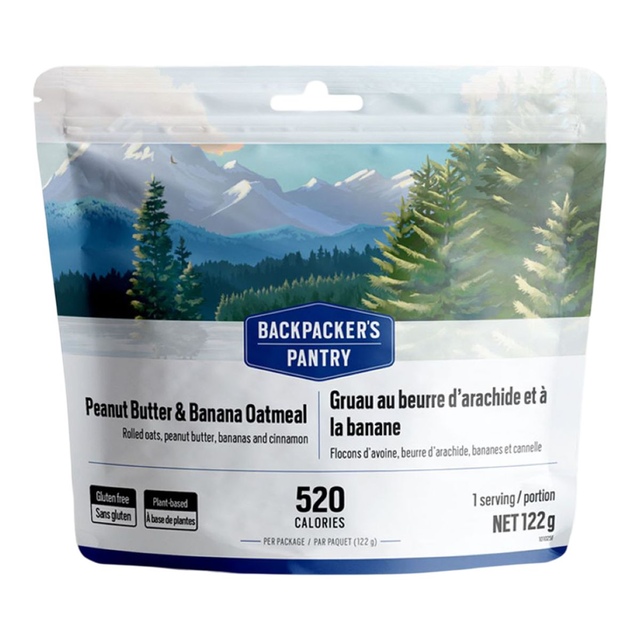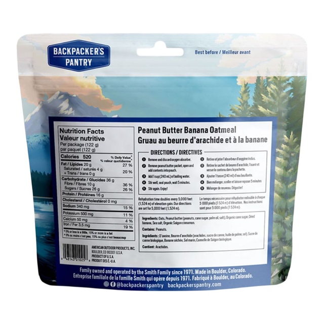 Refuel in the wild with Backpacker's Pantry Peanut Butter and Banana Oatmeal. This hearty blend combines whole grain oats, peanut butter, organic cane sugar, bananas, sea salt and organic cinnamon for a delicious and energizing breakfast. Easy to prepare, this Backpacker's Pantry freeze-dried oatmeal is the perfect start to a day on the trail.