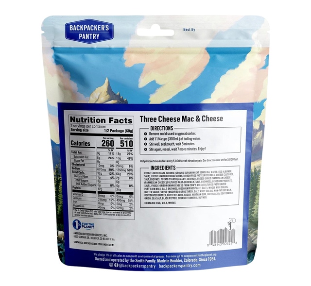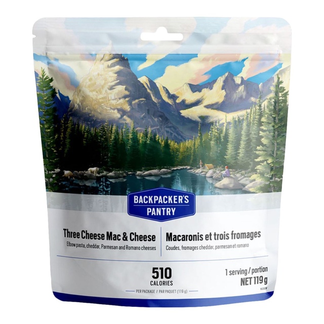 Take your favourite comfort food on the trail with Backpacker's Pantry Three Cheese Macaroni & Cheese. This delicious recipe features elbow pasta blended with Parmesan, Romano, and Cheddar cheeses. This filling dish provides 24g of protein and 510 calories per serving. At 119g, this Backpacker's Pantry Three Cheese Macaroni is compact, lightweight nutrition.