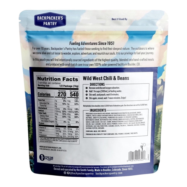 Refuel on the trails with Backpacker's Pantry Wild West Chili and Beans. Featuring a hearty blend of savoury spices, tender beans and textured wheat protein, this chili is a delicious meal you can enjoy whether hiking or camping. This Backpacker's Pantry chili is easy to prepare with the addition of hot water, making it a convenient choice for adventurers.