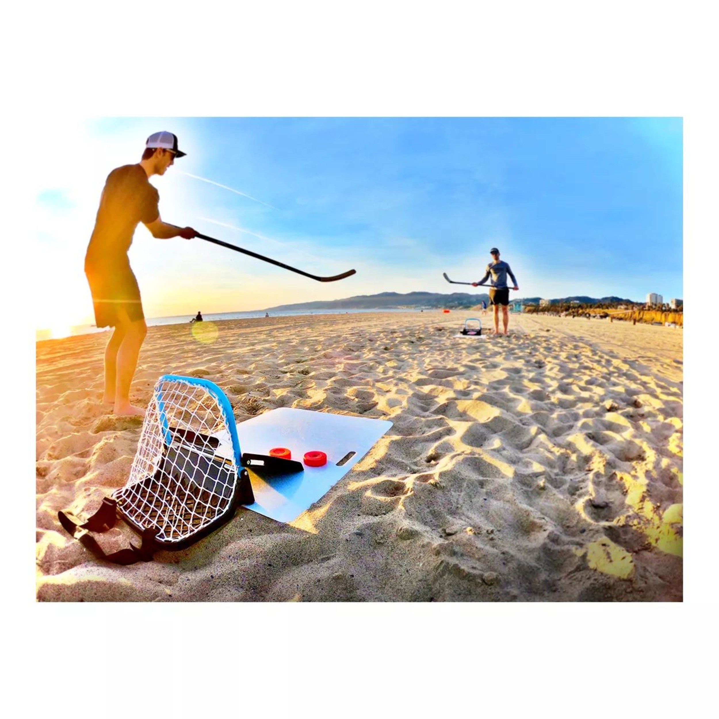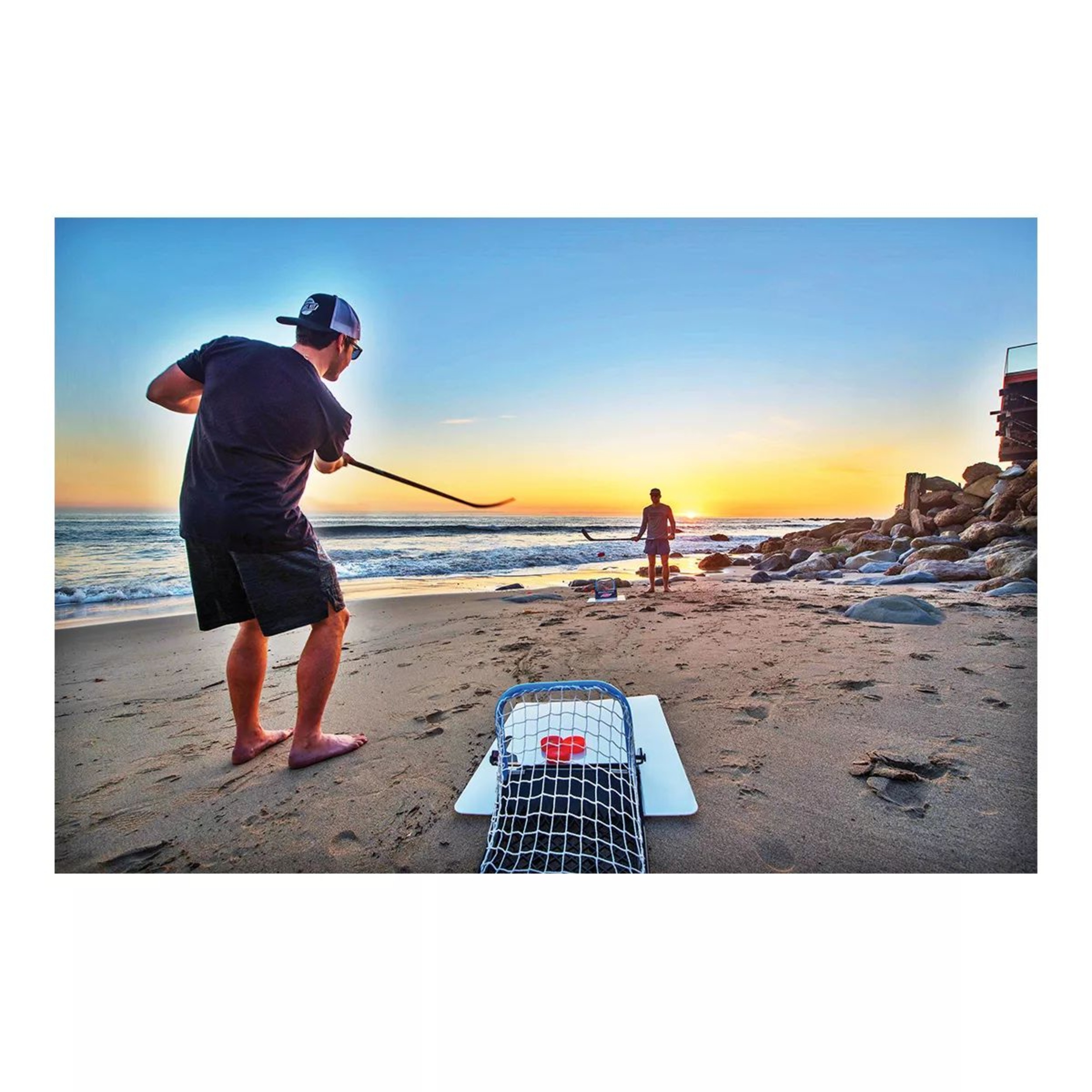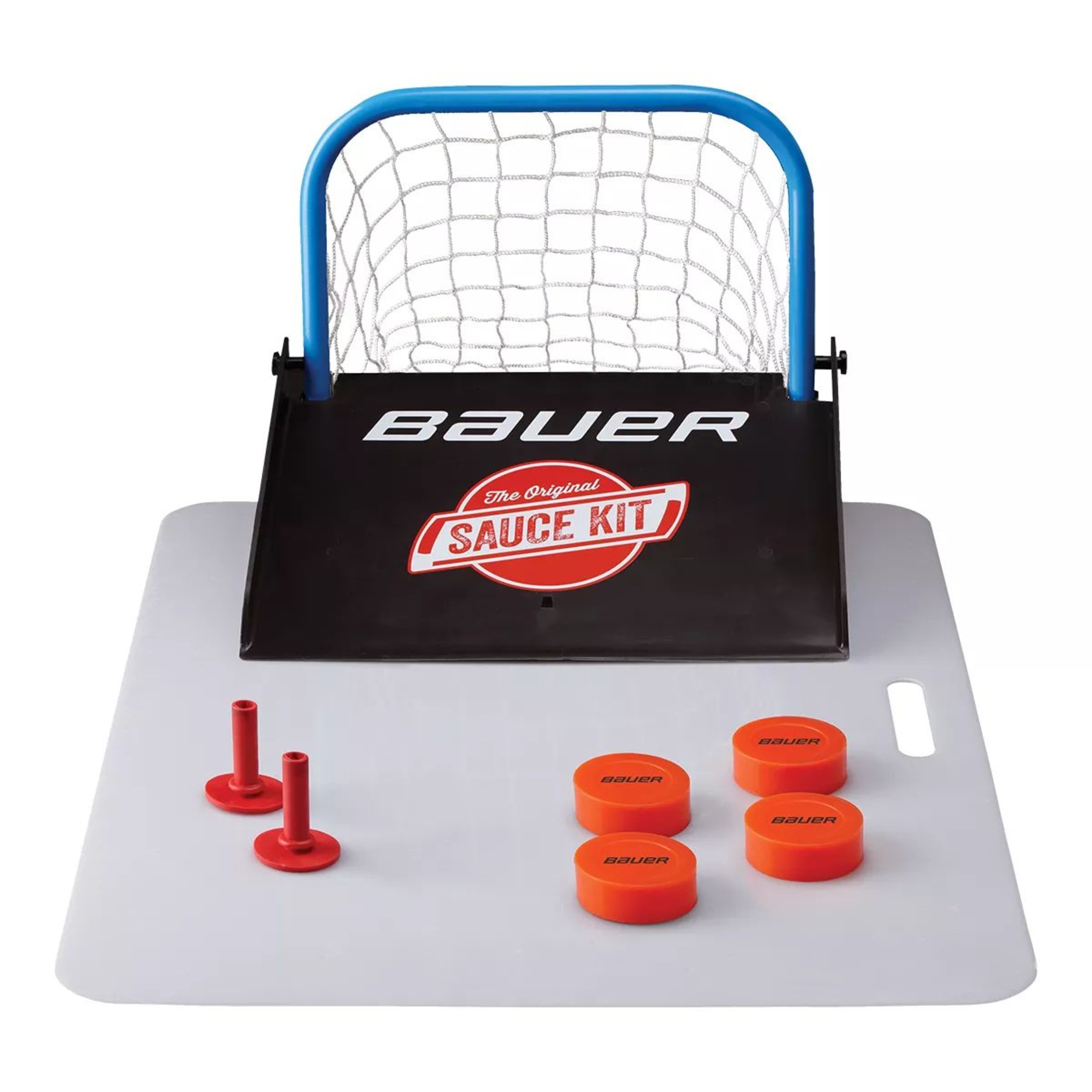 The Bauer Hockey Sauce Kit is the original hockey yard game and training kit for hockey enthusiasts of all skill levels. Made by Bauer, the kit features patented goal nets with metal posts and real twine netting, along with AAA-grade synthetic ice boards and plastic pucks. Set up this portable kit anywhere from your backyard to the beach for a hockey-inspired game that tests your skills. Endorsed by elite professional players, the Hockey Sauce Kit allows you to practice trick shots and improve your game.
