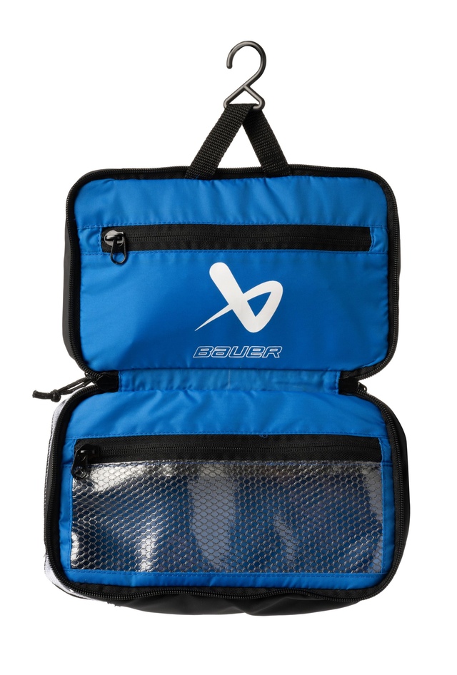 The Bauer Premium Shower Hockey Bag is the ideal companion for your post-game routine. This black toiletry bag is designed to carry all your toiletries, featuring a spacious main compartment for travel-sized items and additional pockets for smaller essentials. The integrated hook allows for convenient hanging.