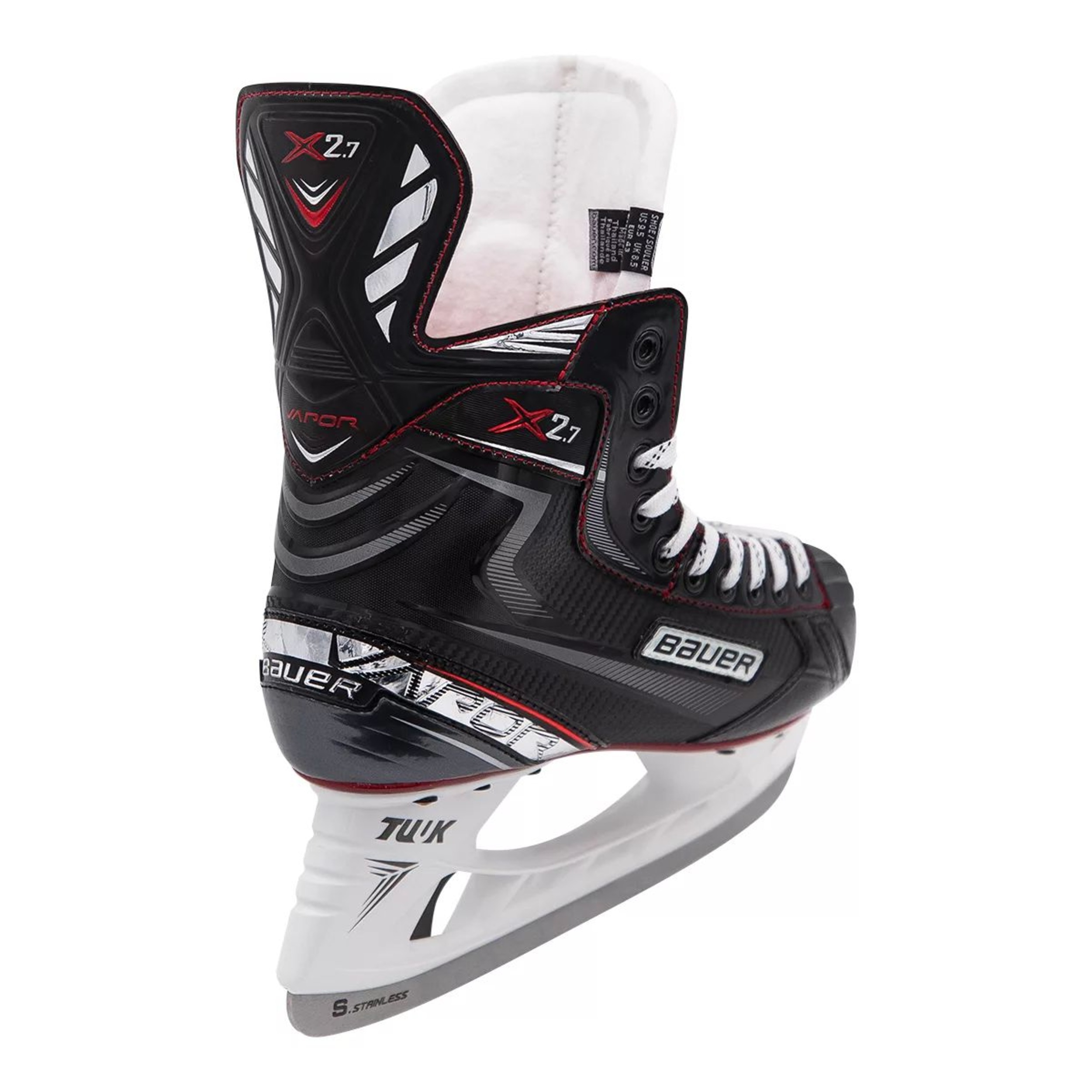 The Vapor X2.7 Skate is built with Bauer's new COMFORT FLEX SYSTEM, which offers step-in comfort, increased visual richness, and additional flex. A one-piece 3D Polycarb quarter construction provides comfort and makes it easier to flex. A Microfiber Liner offers even more comfort and a soft feel. A 40 oz. Felt tongue with exposed injected Metatarsal guard gives you advanced level comfort and additional skate flex for maximum agility.