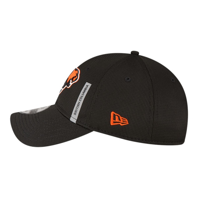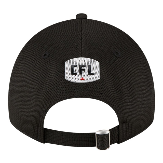 BC Lions Sideline cap. This 9TWENTY lightly structured adjustable cap has team color pivot mesh fabrication throughout. Lions logo, a high density silicone rubber patch with embroidery, on the front panels. A metallic chrome CFL badge adorns the back of cap above fabric strap closure.