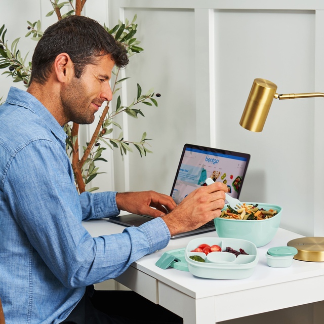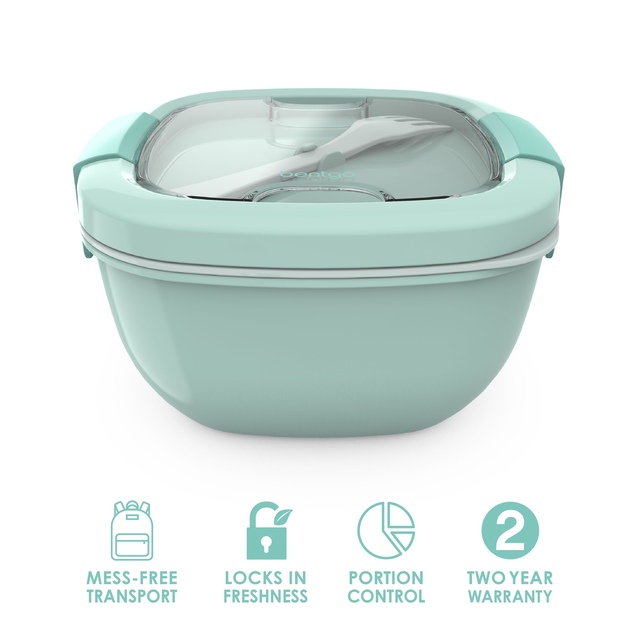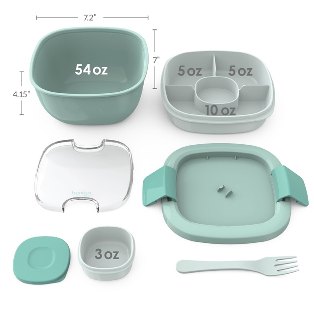 Bentgo Salad makes eating fresh and healthy salads while on-the-go easier than ever. The all-in-one design offers the perfect solution for mess-free transport of your greens, salad toppings, and salad dressing so you can enjoy a delicious and nutritious salad at school, work, on a plane, at the park, or just about anywhere. Bentgo Salad’s large salad bowl with lid easily holds up to four cups of greens, pasta, or fruit making it the perfect size for even the hungriest appetites. With one large 10-ounce compartment and two smaller 5-ounce compartments, the compartment tray easily configures to hold three or more salad toppings or snacks. Locking in freshness is a breeze thanks to the sealing technology built into the top lid of the Bentgo Salad container. The lid’s Tritan™ cutlery cover keeps the reusable fork sanitary during travel and even has enough room to hold a paper napkin. Product Specifications Dimensions: 7.2” w x 7“ d x 4.15” h Salad Bowl Capacity: 54 oz Sauce Container Capacity: 3 oz Compartment Tray Capacity: Large Compartment-10 oz; Small Compartments (5 oz)