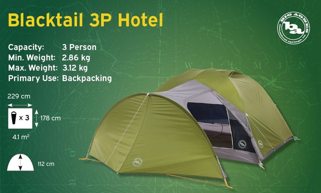 The Big Agnes Blacktail Hotel 3 Lightweight Comfortable 3 Person Backpacking Tent features a massive, extended side-entry vestibule area that attaches to the fly and provides covered shelter for bikes, climbing gear, or your best furry friend. Double doors, a simplified symmetrical pole structure, and additional dry storage make backcountry trips with a smelly partner−or three−more comfortable than you may have thought possible. The Blacktail series remains as one of our longest-running tent series - a tried and true shelter with excellent value for backpackers who want a super comfortable tent to bring on the trail or setup a sweet car camping basecamp.