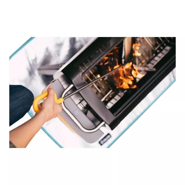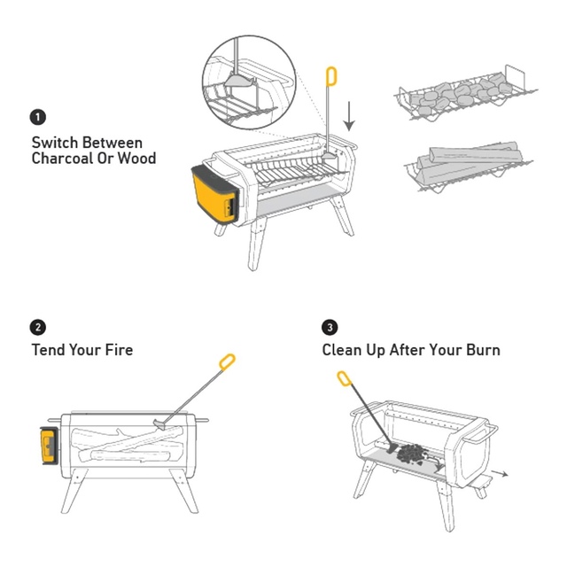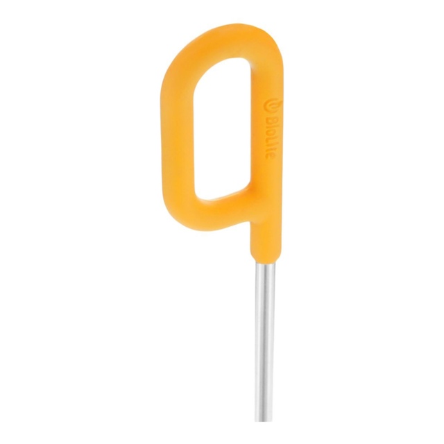 • The curved point easily hooks onto the BioLite FirePit's fuel rack for quick adjustment to charcoal or wood settings