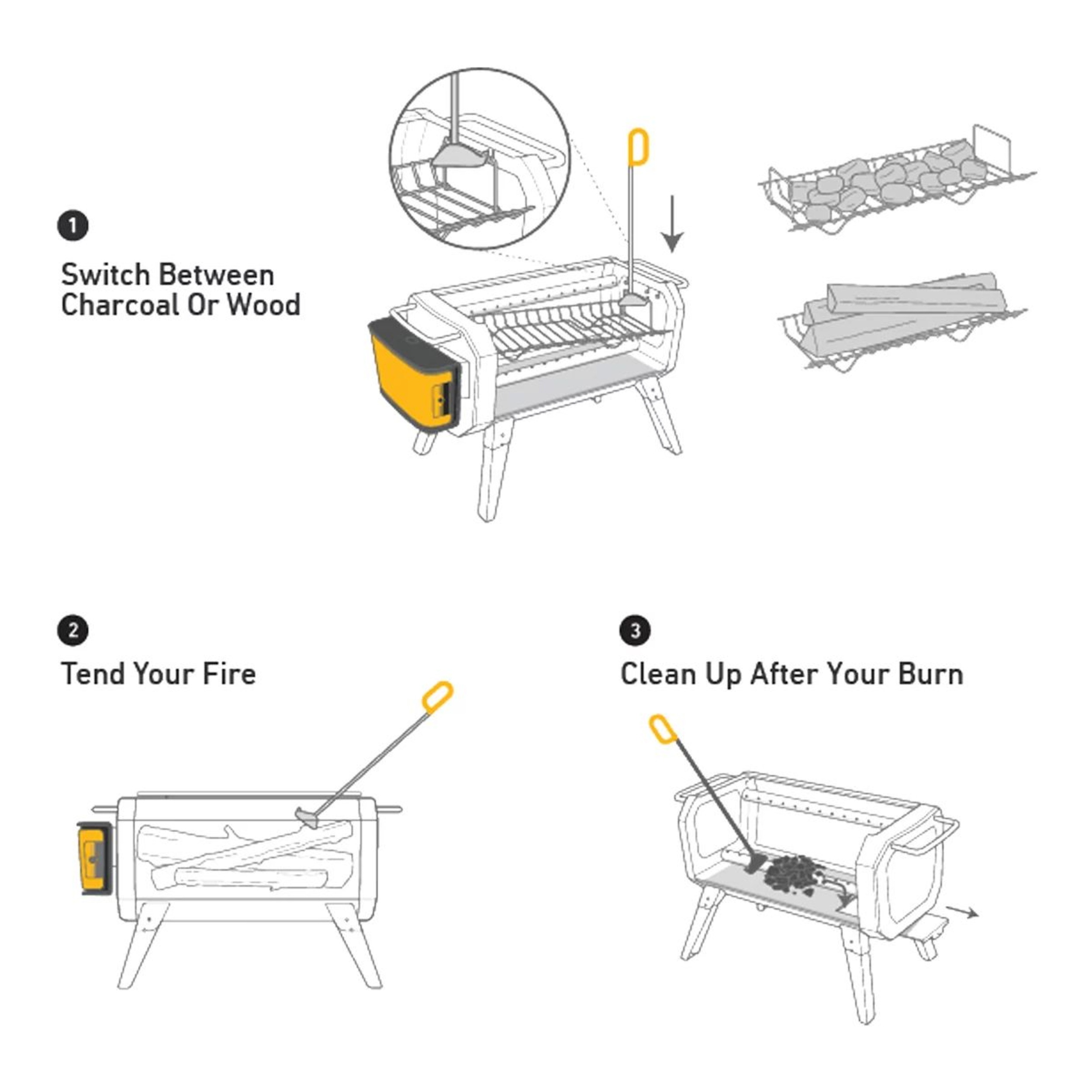 The curved point easily hooks onto the BioLite FirePit's fuel rack for quick adjustment to charcoal or wood settings