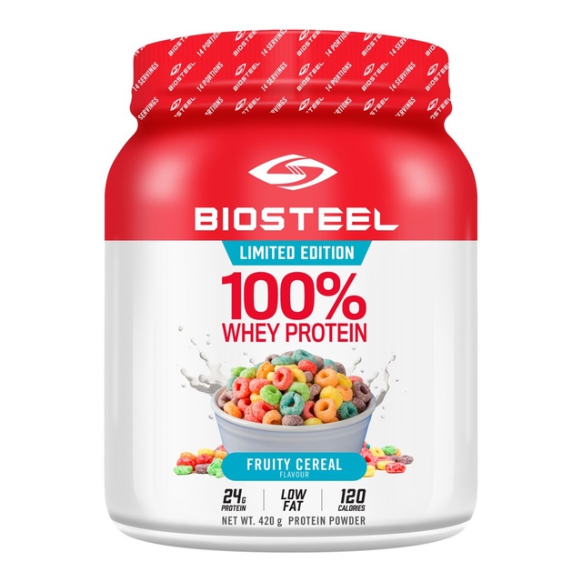 The BioSteel 100% Whey Protein Fruity Cereal offers essential proteins to your body after a workout. It provides a blend of three high-quality protein sources with optimum nutritional benefits that are easily absorbed and digested by the body. Gluten and soy free, this whey protein includes primary whey isolate and concentrate for enhanced absorption.