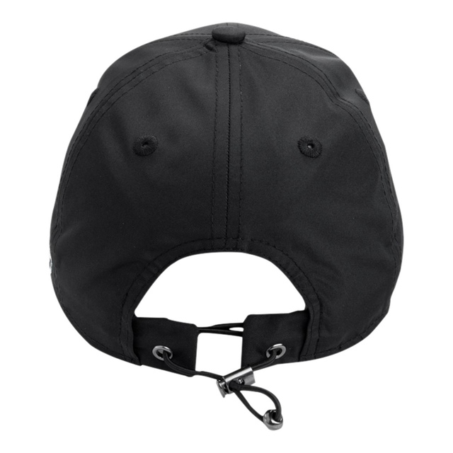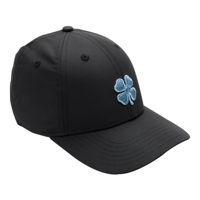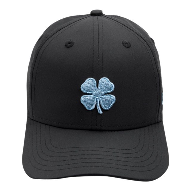 This ladies' hat features a Metallic Blue Clover design with black hat, constructed from Performance Poly Tech fabric and adjustable back toggle for a feminine fit.