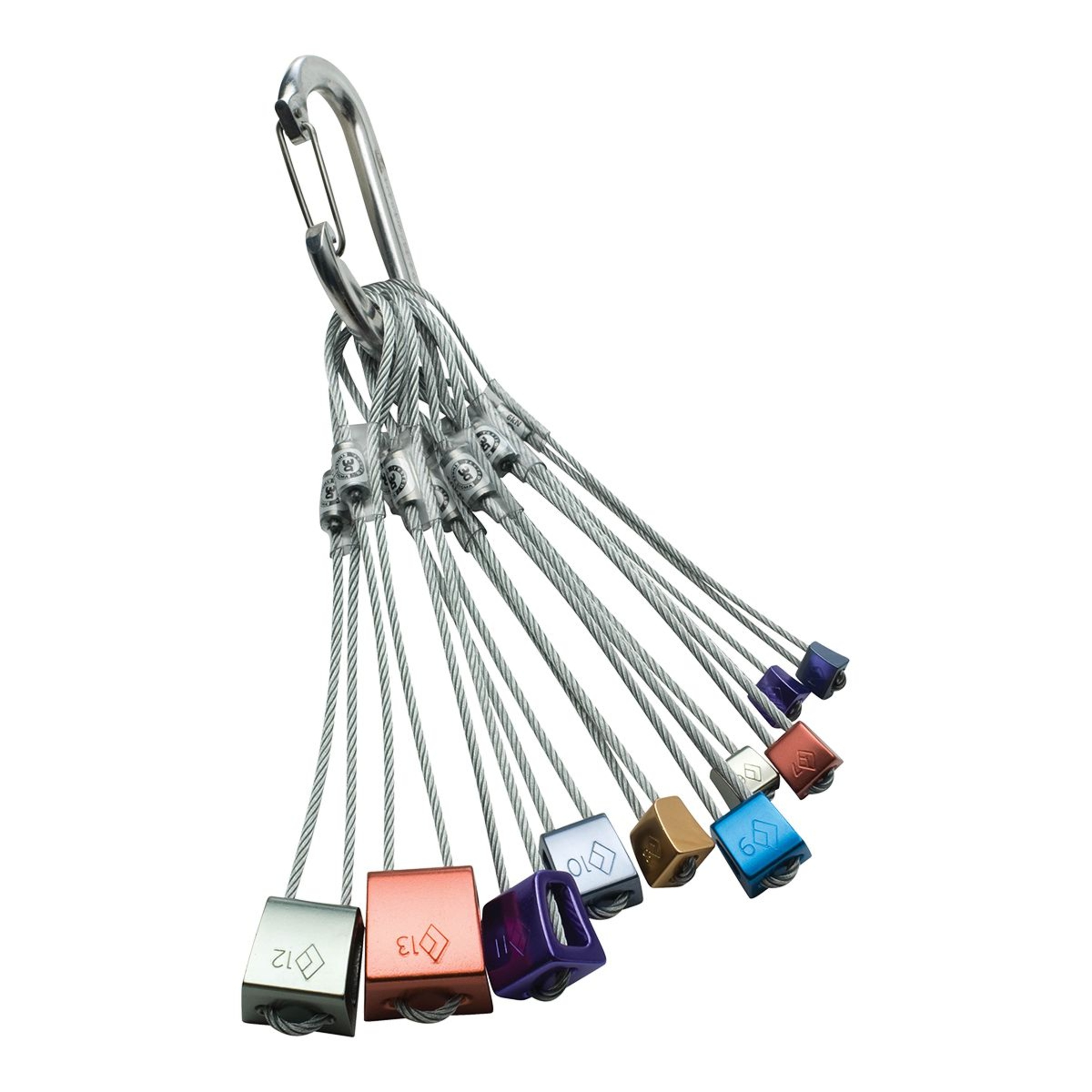 The Black Diamond Climbing Nut Stopper Set #4-13 is a must-have tool for protecting yourself during rock climbing adventures. Featuring a transverse taper design, these versatile stoppers are ideal for secure placement in parallel fractures, constrictions, and cracks. The round edges of the stoppers simplify the removal process, and the sturdy aluminum heads are anodized in a size-specific pattern for quick & easy identification. These dependable stoppers come with galvanised steel cables for improved protection on bumpy and uneven roads.