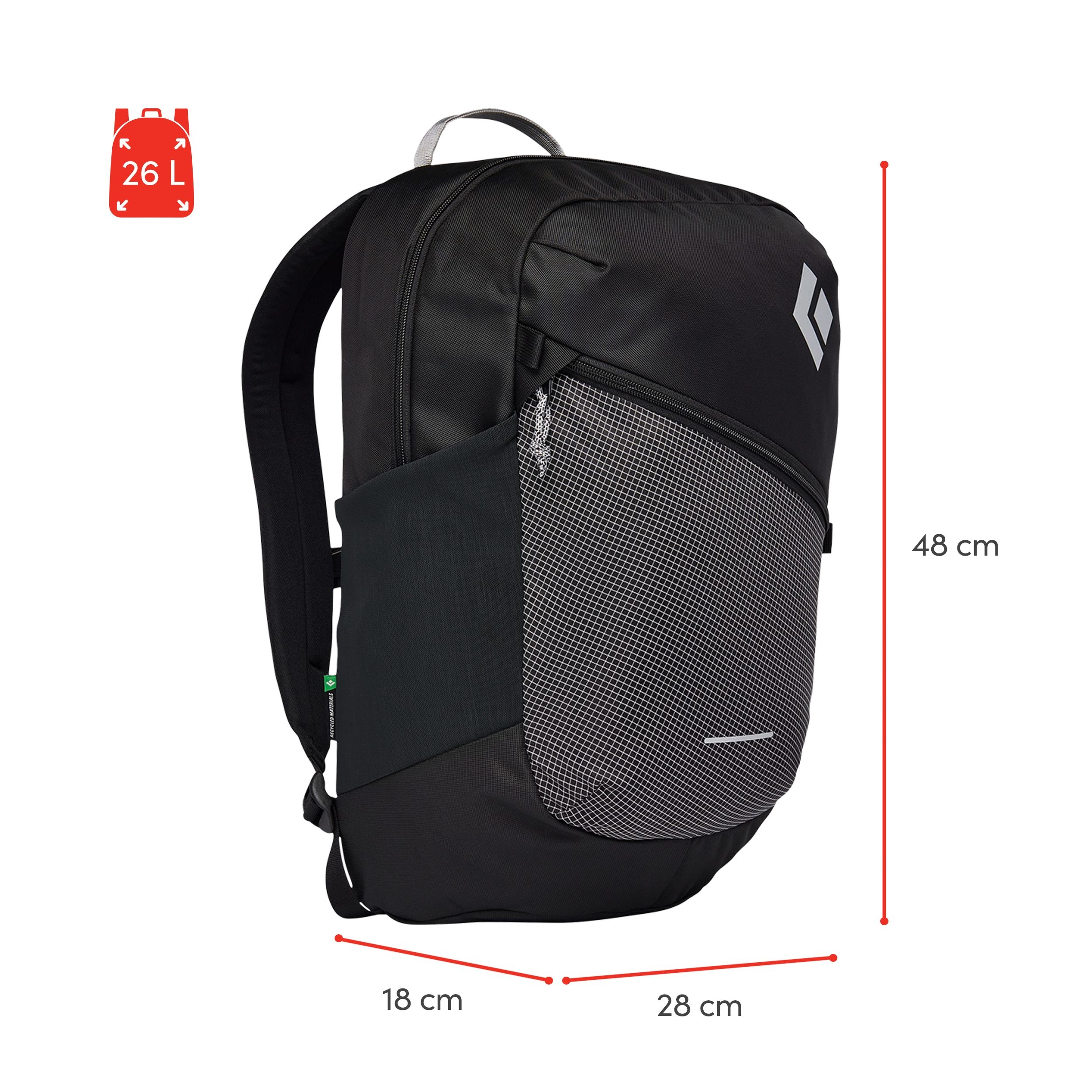 "100% Recycled body fabric—Eco-conscious BD Mini Ripstop combined with an 840d polyester create a new level of style and protection with 100% post consumer recycled fibers made from discarded water bottles"