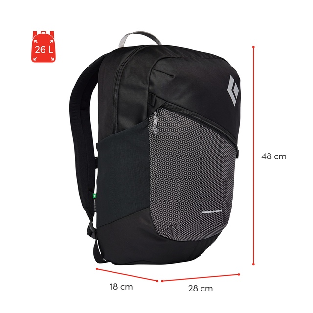 Black Diamond’s sleek 26-liter daypack, the Logos 26 features an internal organizer and electronics sleeve and a super stretchy external side pocket that securely holds a water bottle or climbing shoes. The S-curve shaped, comfortable foam shoulder straps make for great load carrying and the main pack body is built from 100% recycled fabrics.
