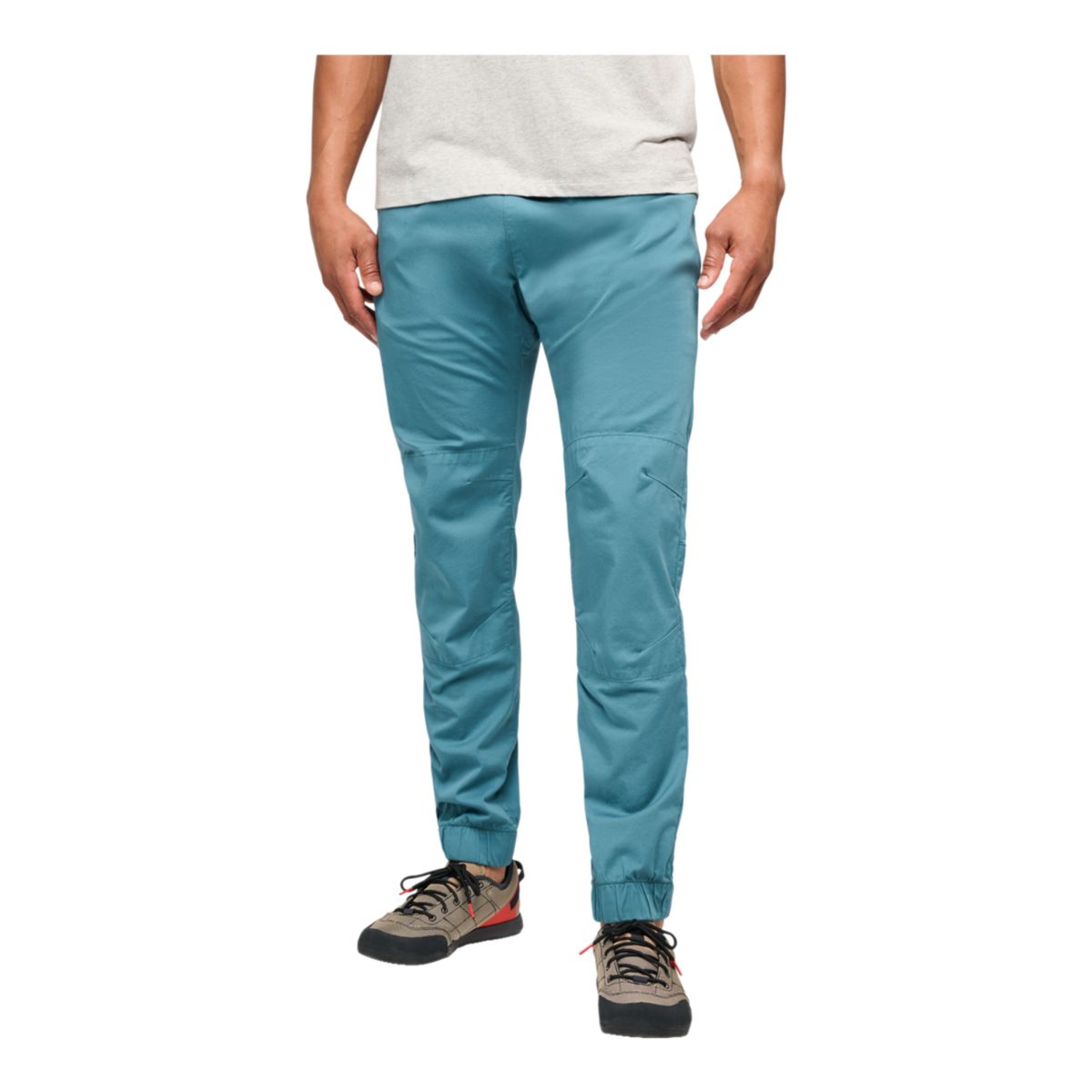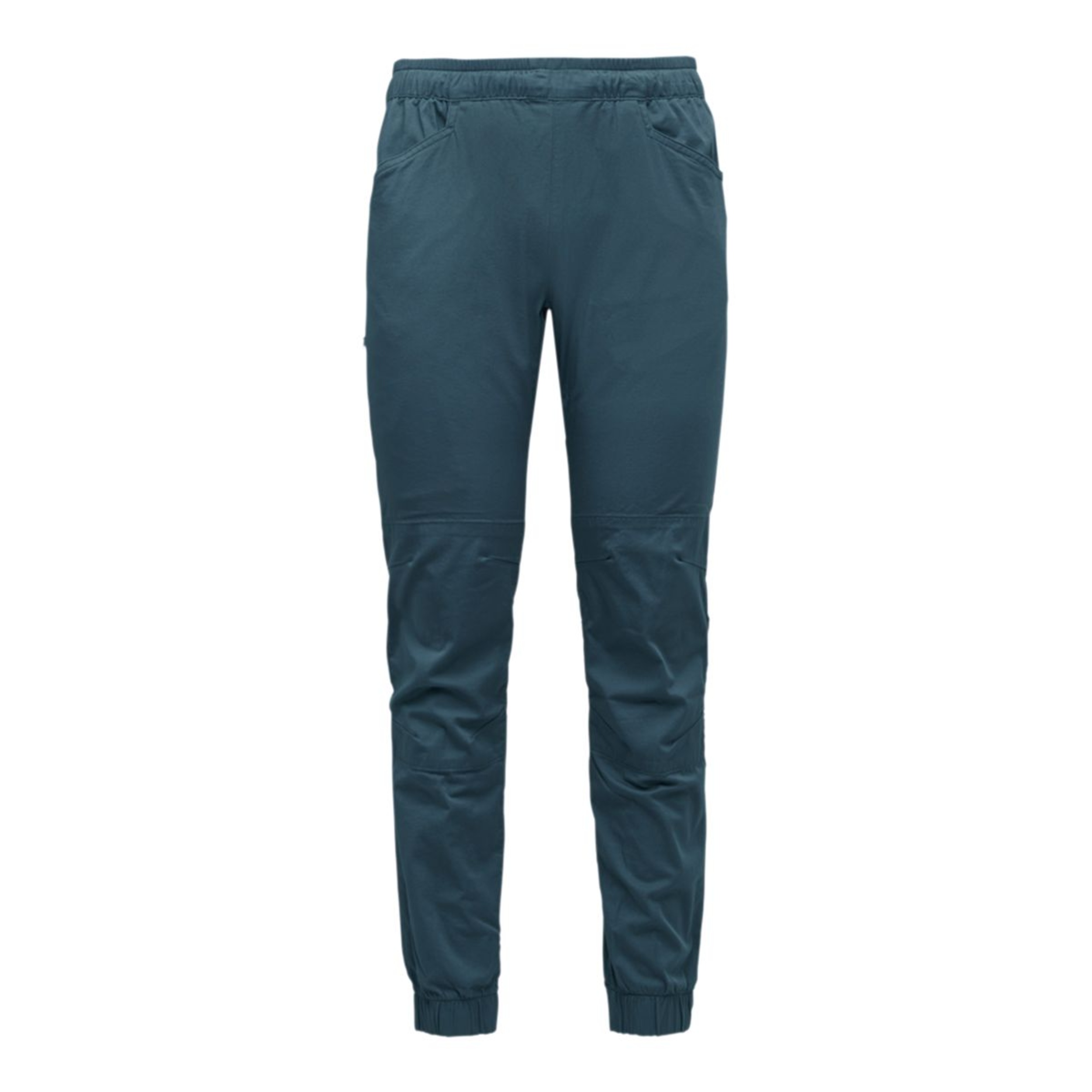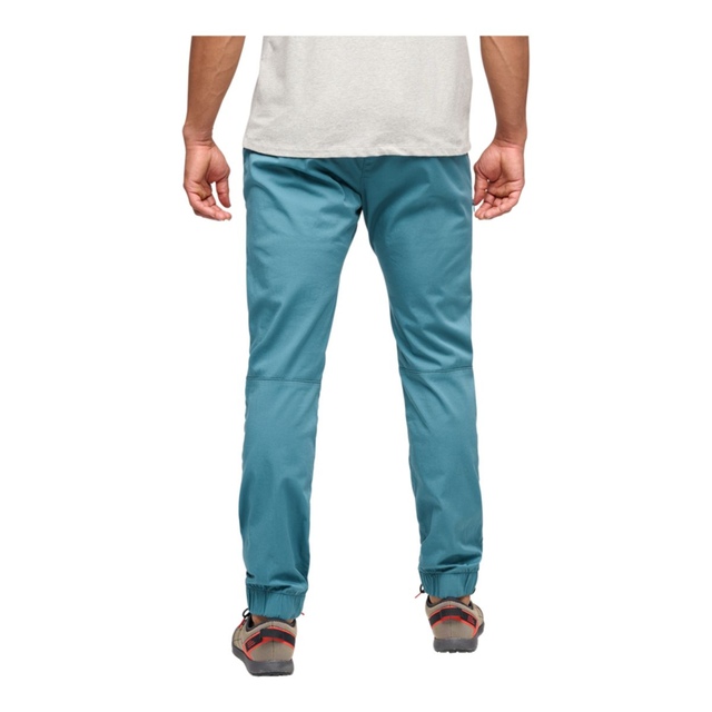 The Black Diamond Men's Notion Pants are designed for comfort and durability. Made from stretch organic cotton twill, they feature an elastic waistband for a secure fit under a harness. Articulated knees and a gusseted inseam provide full mobility, while elasticized cuffs offer a snug finish. With multiple pockets, including a zip pocket on the right side, these pants deliver both performance and convenience.