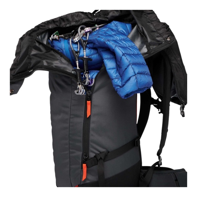 Tuck-away ice-axe loop and top compression straps securely attach extra gear to the exterior
