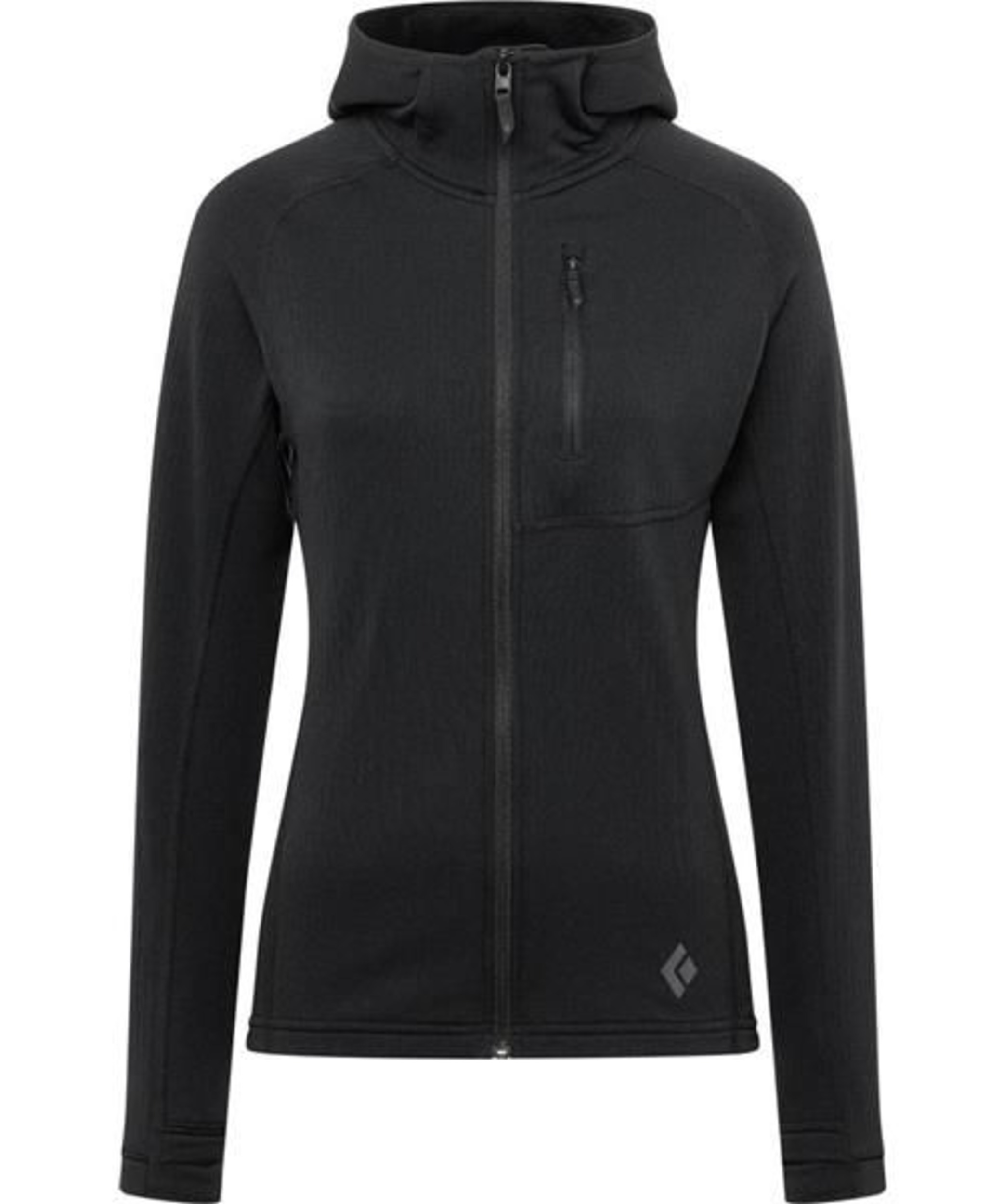 The Black Diamond Women's Coefficient Light Hoodie offers optimal warmth and mobility. Made with Polartec Power Dry Fleece, it features lightweight stretch thumbhole cuffs, a zippered chest pocket and a low-profile hood that fits under helmets. The fabric used in this Black Diamond hoodie is bluesign® approved for sustainability.