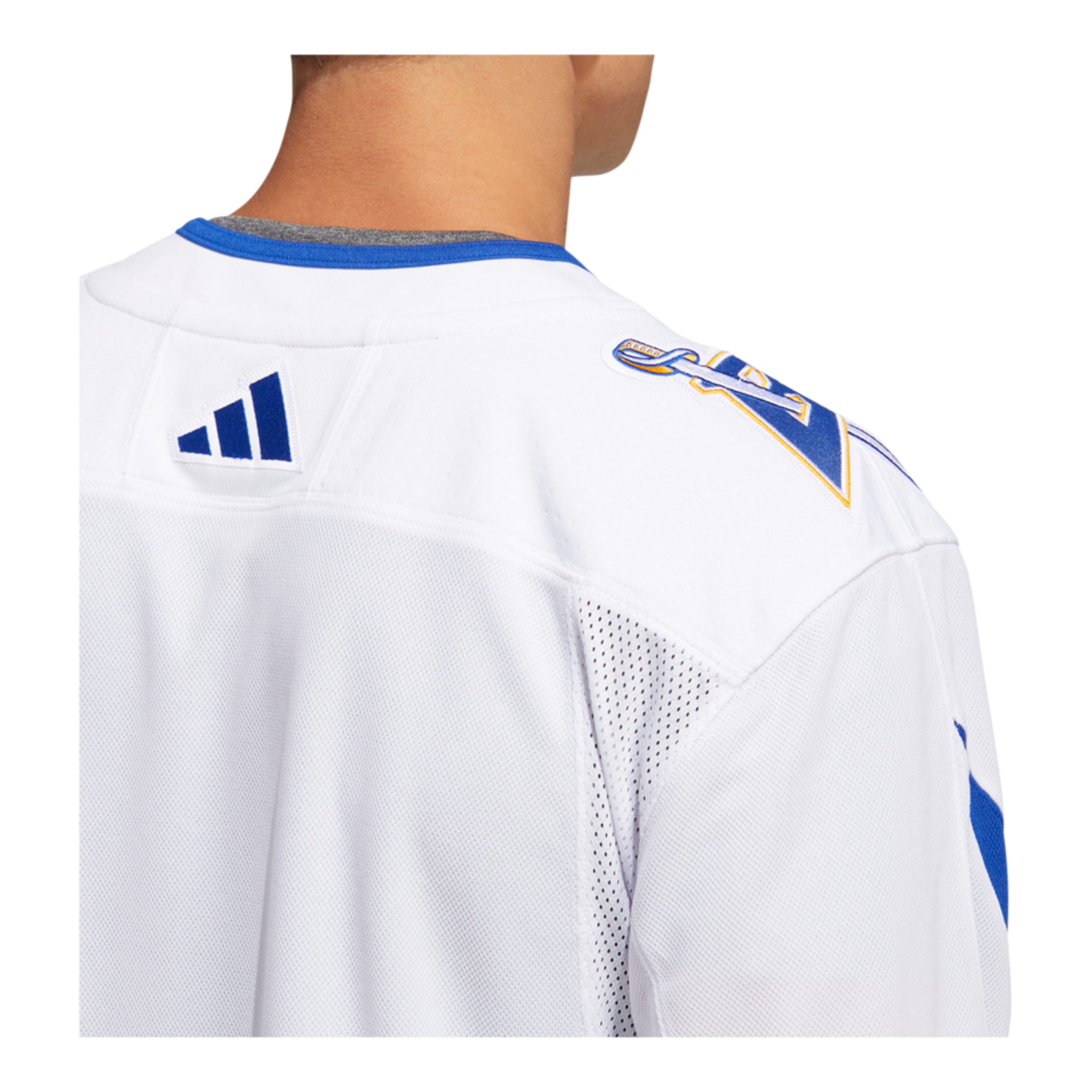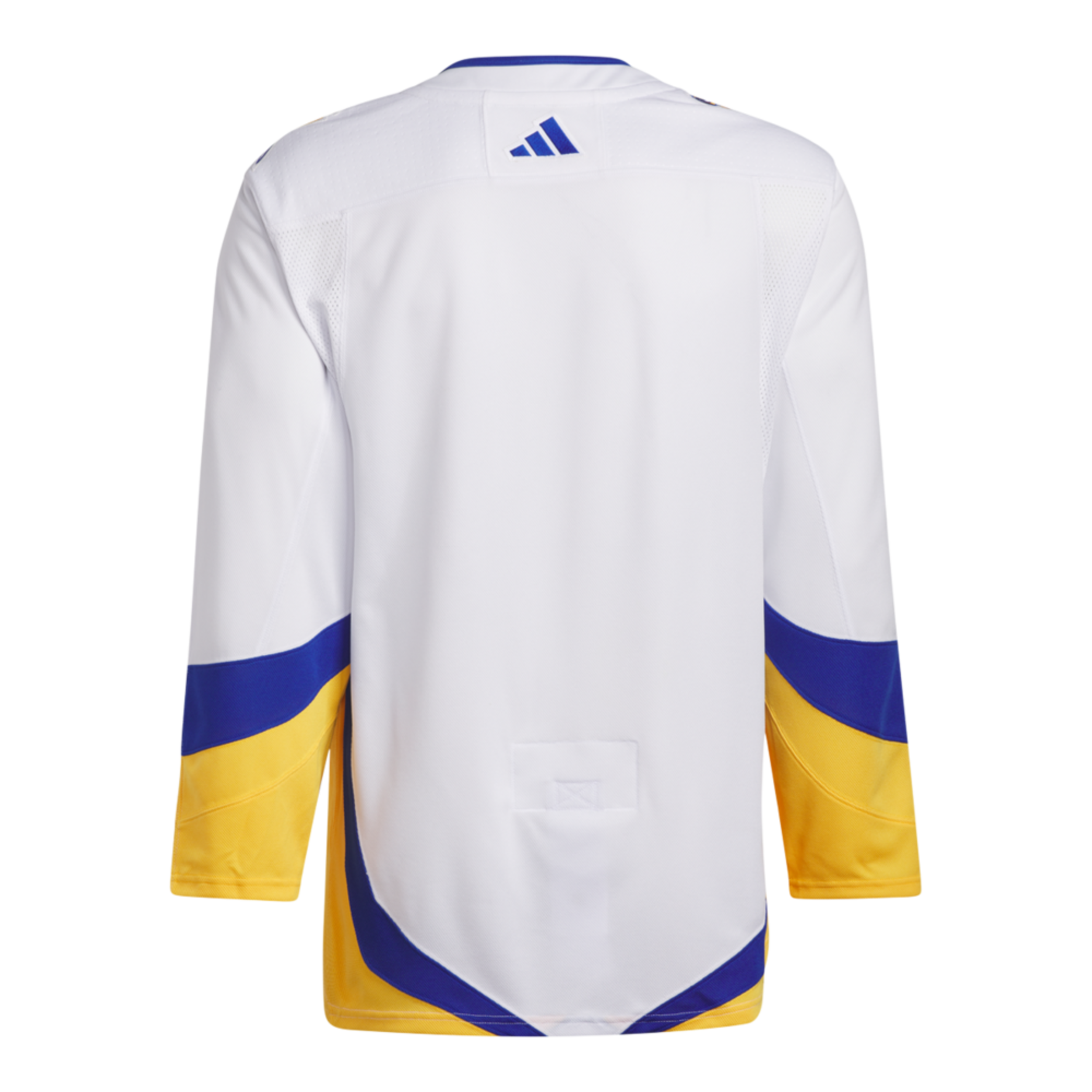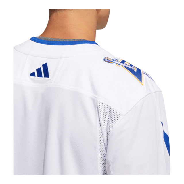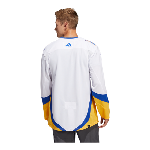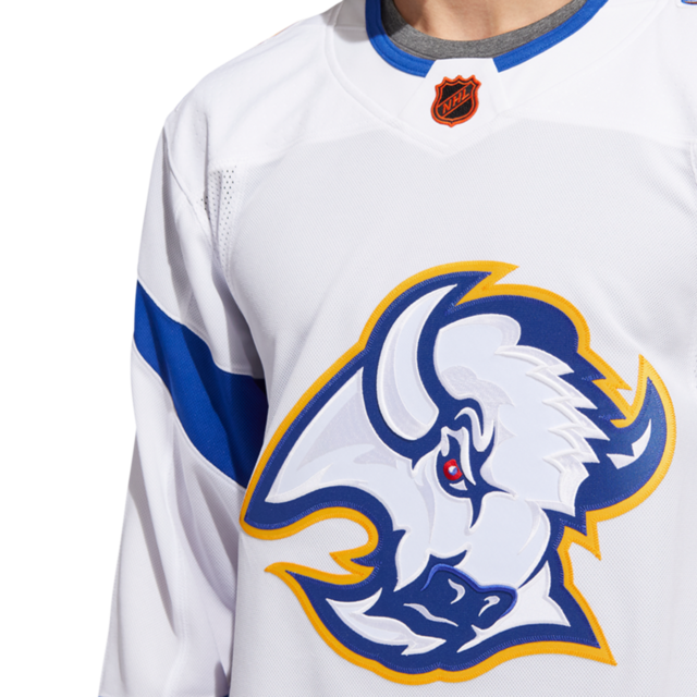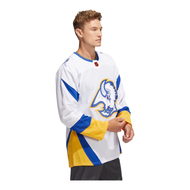 Look closely, and you'll see that the front striping on the Buffalo Sabres' 1996 jersey creates a subtle outline of a bison, complete with horns. Remixed by adidas with a bold design and the planet in mind, the "Goat Head" gallops again with a luxe crest and another bovine brother along for the ride. Made with 100% recycled materials, this product represents just one of adidas' solutions to help end plastic waste.