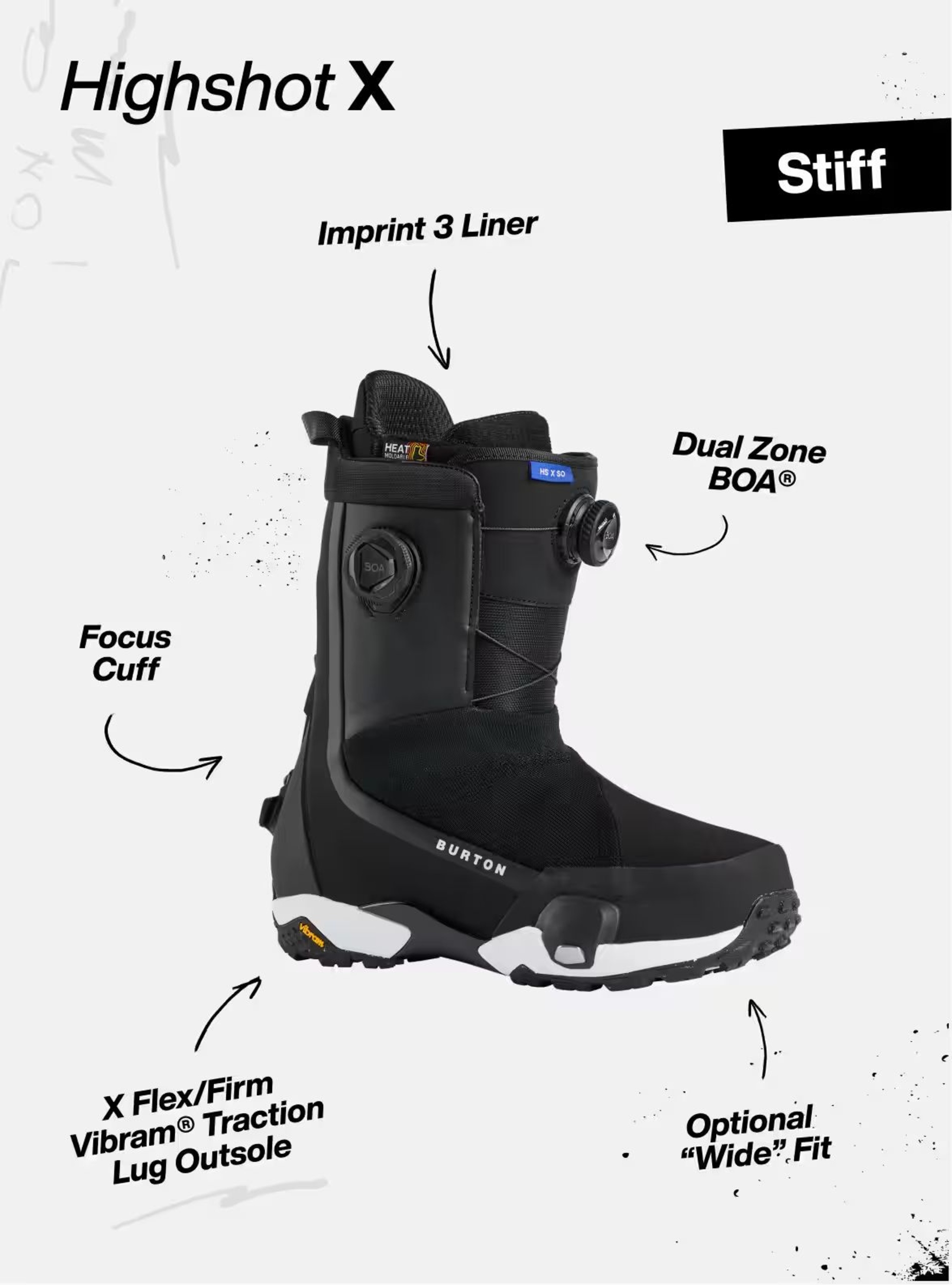 The Burton Highshot X Step On® Men's Snowboard Boots offer total control with micro-adjustable fit and tensioning around your foot. Featuring a Sequence BOA® Fit System, these men's snowboard boots let you dial in the perfect shell closure and tension with a single turn. The heat moldable liner provides out-of-the-box comfort with no break-in required, while the supportive, medium-stiff flex delivers powerful response on the mountain. An environmentally-friendly Burton recycled rubber outsole with 20% recycled content ensures reliable all-purpose traction. The Step On® system creates a clean, simple boot-to-binding interface for true convenience.