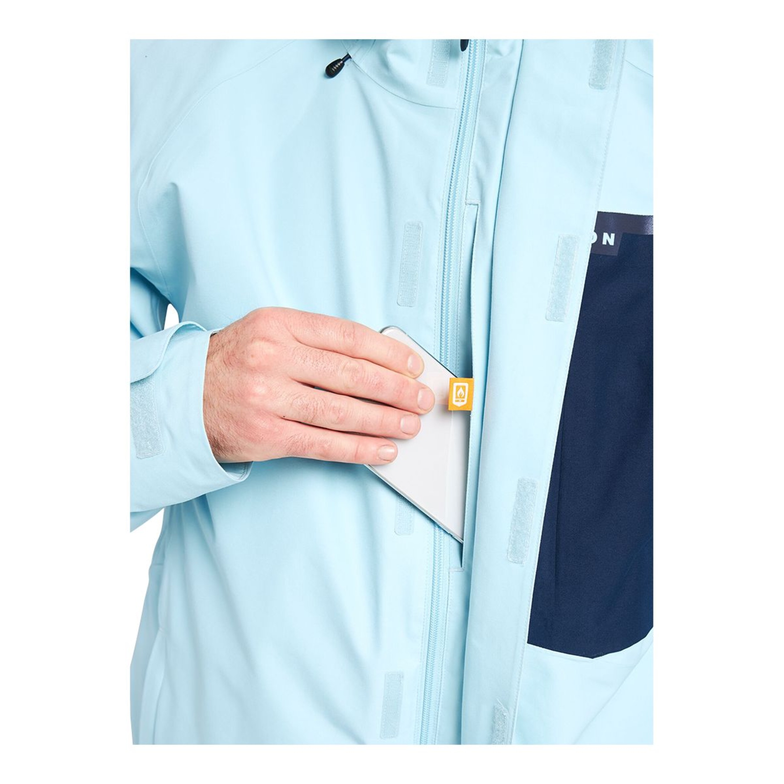 Media pocket with hook-and-loop closure, zippered chest pocket, zippered sleeve pass pocket, and zippered microfleece hand-warmer pockets