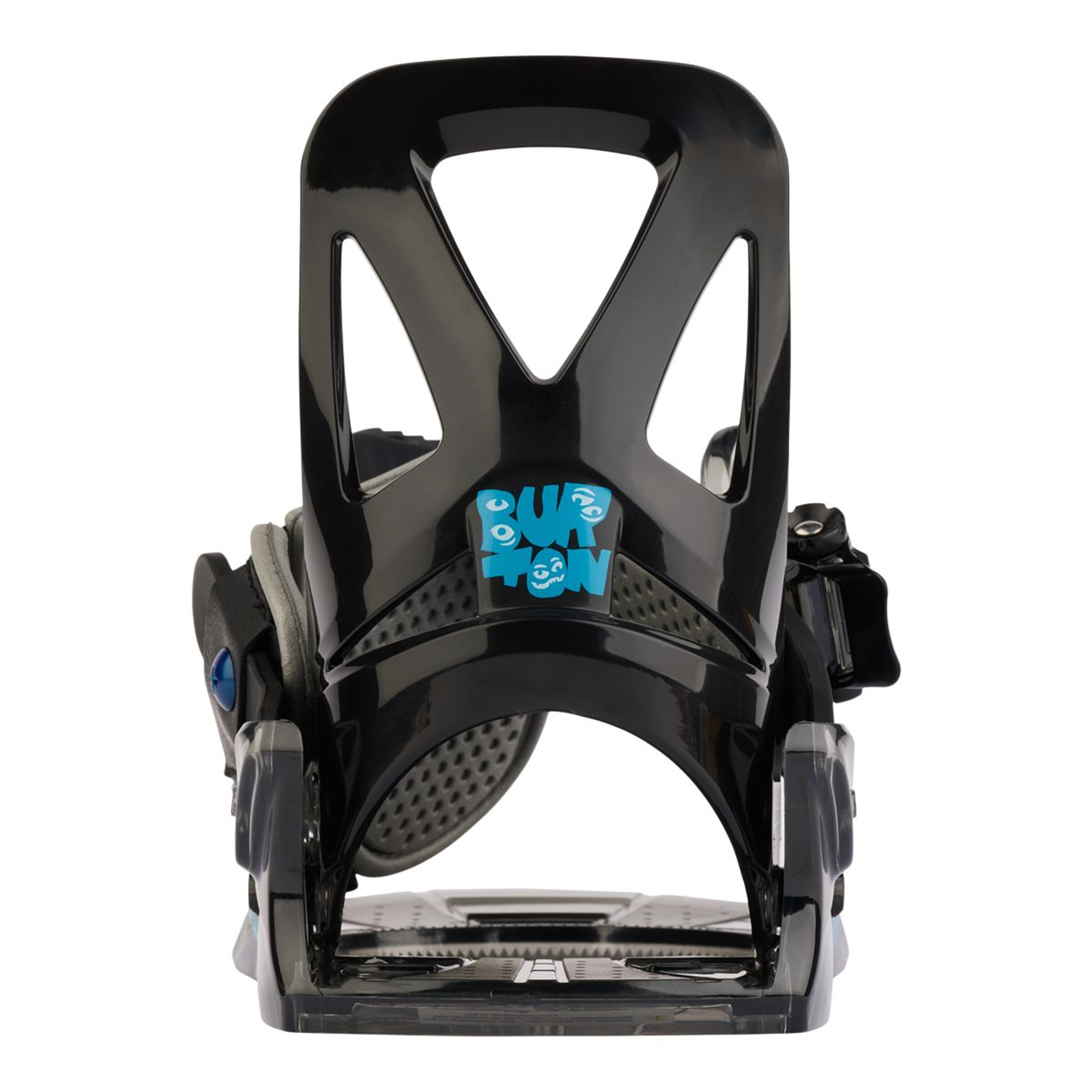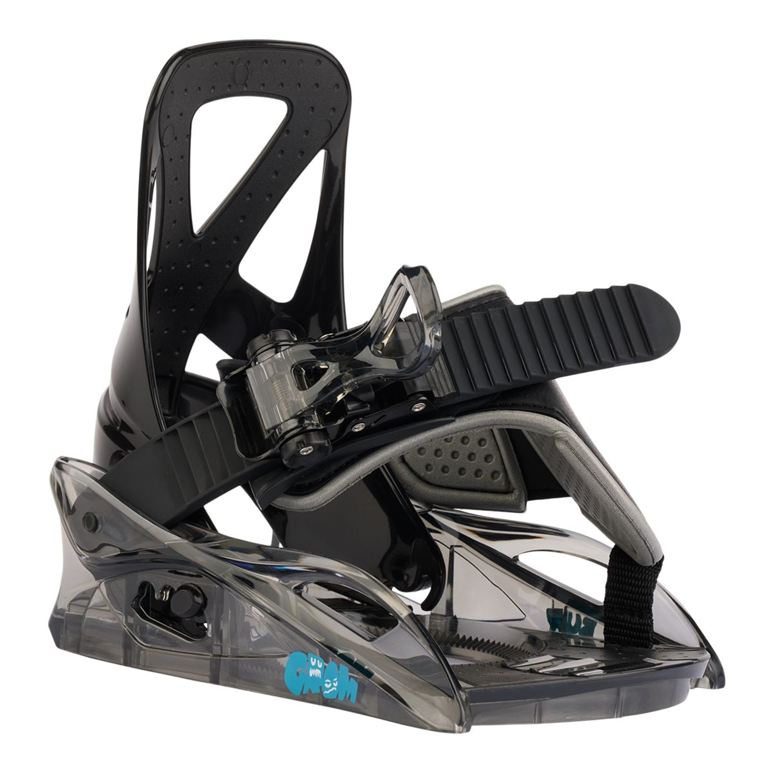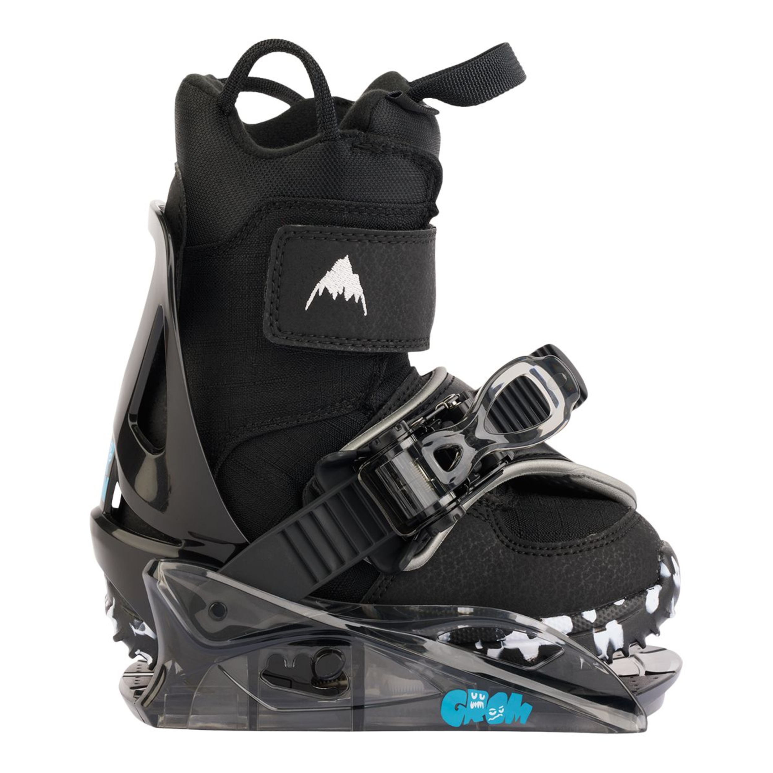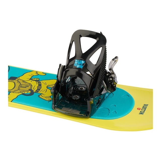 The kids' Burton Mini Grom Disc bindings let even the youngest riders enjoy the freedom of strapping in and cruising all on their own. Designed in collaboration with Burton employees and their kids, they feature a single oversize, mitten-friendly buckle and strap design for easy entry and exit. Their lightweight, soft-flexing design adds to the ease of use.