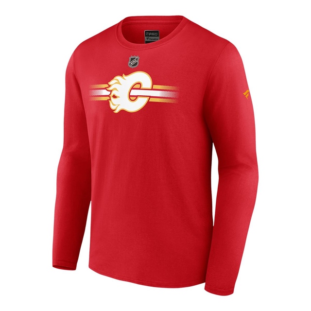 Show your Calgary Flames pride in this cozy long sleeve tee. The soft, 100% cotton material keeps you comfortable whether you're cheering in the arena or watching the game at home. The large plastisol logo stands out boldly on the chest while smaller logos on the sleeve and neck tag your love for the NHL. As part of the officially licensed Authentic Pro Rink collection, this top meets league standards for quality and design. The classic crew neck and long sleeve silhouette provides a timeless look that pairs perfectly with jeans or leggings. Stay warm while repping your Flames spirit all season long in this essential fanwear staple.