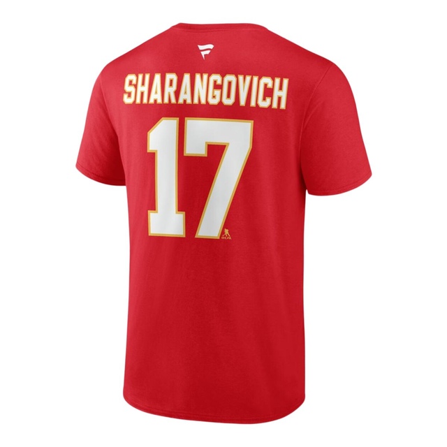 The Calgary Flames Fanatics Yegor Sharangovich T Shirt is the perfect way for devoted fans to showcase their allegiance. This NHL-licensed product features an authentic player tee design with Yegor Sharangovich's name and number printed on a high-quality 100% cotton jersey material. The breathable and comfortable solid tee allows you to proudly represent your favorite player both on and off the ice.