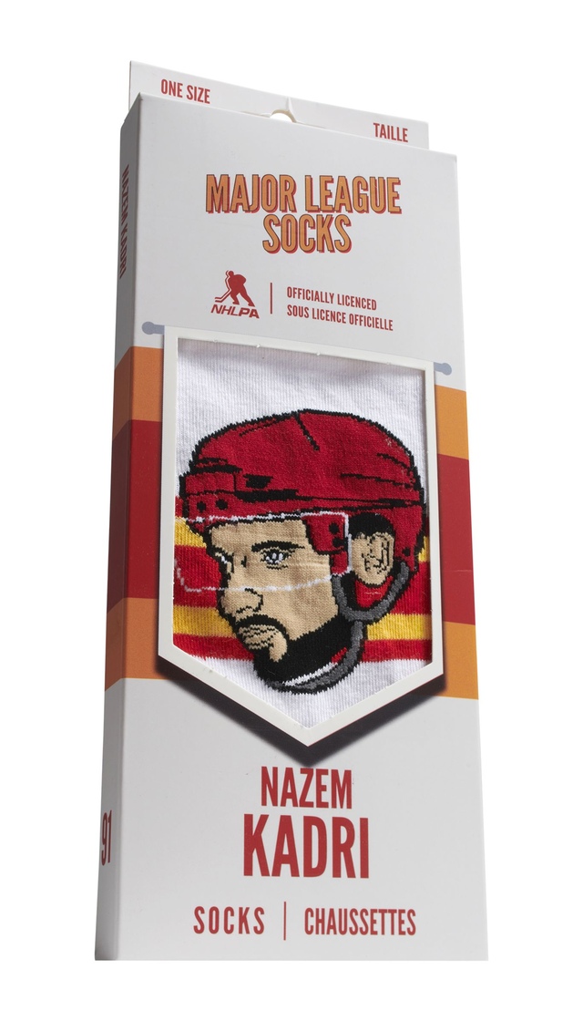 The Calgary Flames Major League Socks Nazem Kadri MLS Socks honour the grit and goal-scoring skill of forward Nazem Kadri. Made with an 80% premium combed cotton blend, 15% nylon, and 5% Lycra, these crew-length socks offer unmatched softness and stretch. Officially licensed by the NHLPA and NHL Alumni Association.