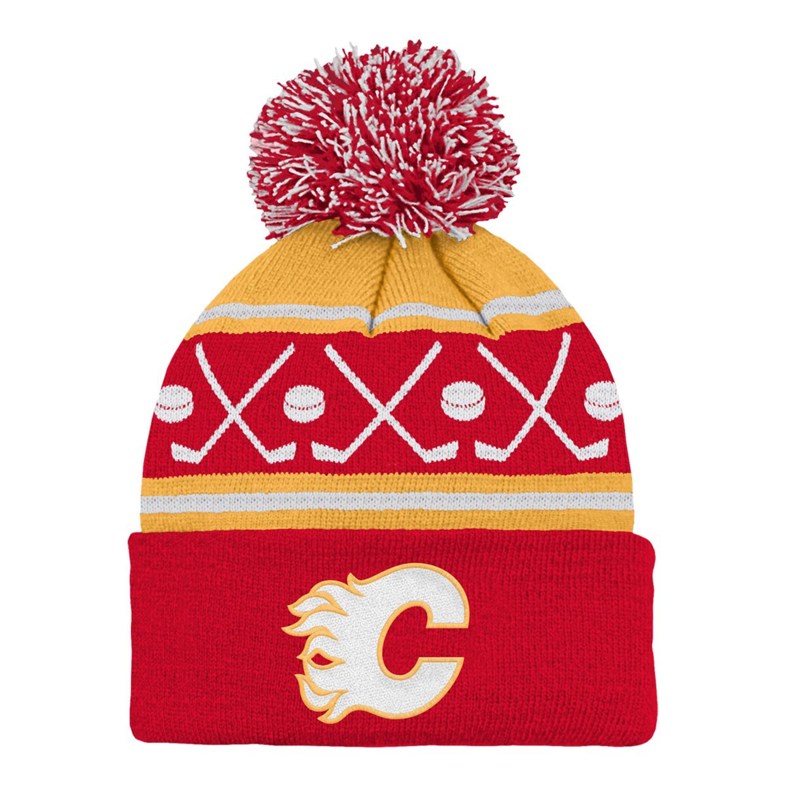 The Calgary Flames Outerstuff Infant Face Off Cuffed Pom Knit Beanie keeps your little fan warm while showing off team pride. Designed in team and alternate colours, it features a hockey stick and puck jacquard pattern. An embroidered logo on the front and the team name on the back add a bold touch. Finished with a mixed-colour pom.