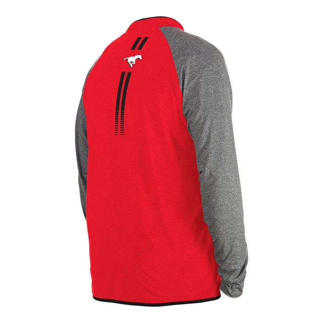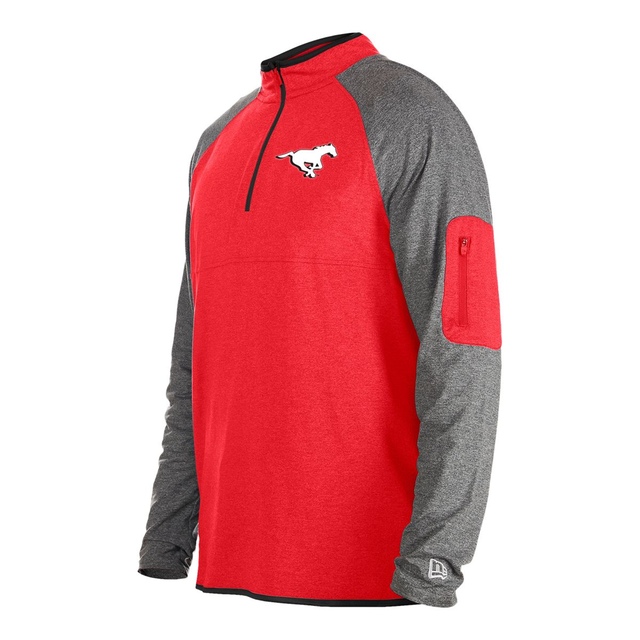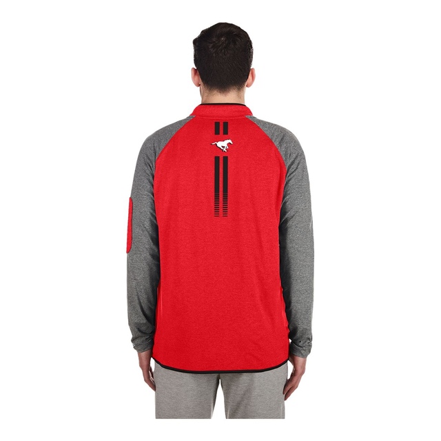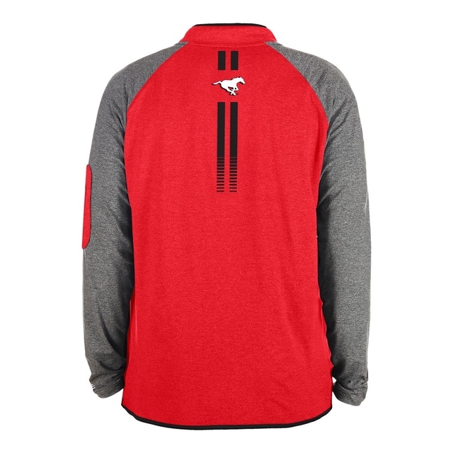 Calgary Stampeders quarter zip fashion top. Team colour body with heather grey sleeves and secondary team color trim. Lightweight performance fabrication. Stamps primary logo screened on left chest with speed stripes and logo screened vertically on center back. A small zip pocket on left sleeve finishes up this clean look top.