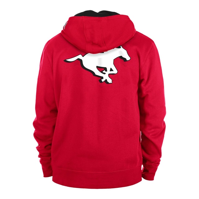 Calgary Stampeders hooded pullover fleece. Large patch applique on the front featuring team and logo. Oversize Stamps logo on the back