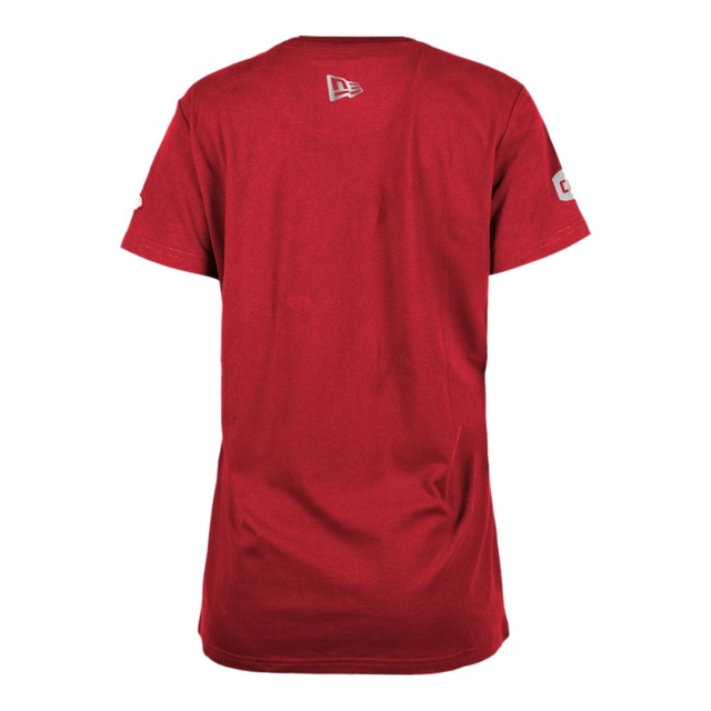 Calgary Stampeders women's Megan tee. Team color short sleeve cotton jersey tee with reflective print, featuring team wordmark and primary logo, on front chest. CFL badge on right sleeve, and reflective Official Sideline on bottom front hem.