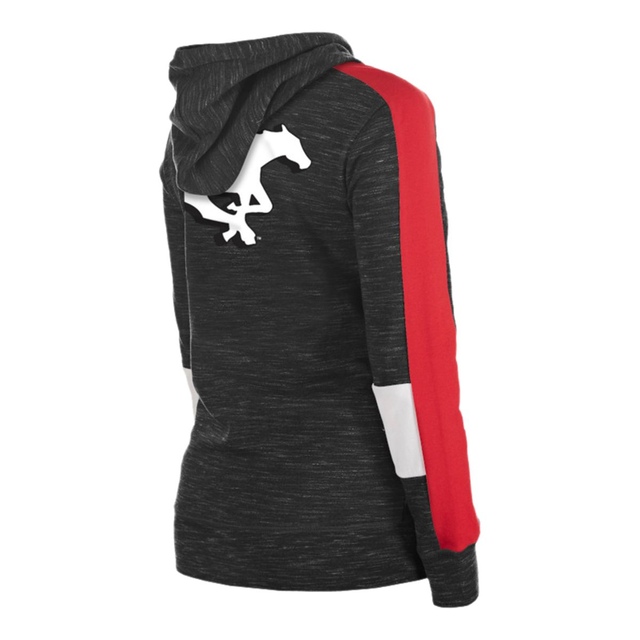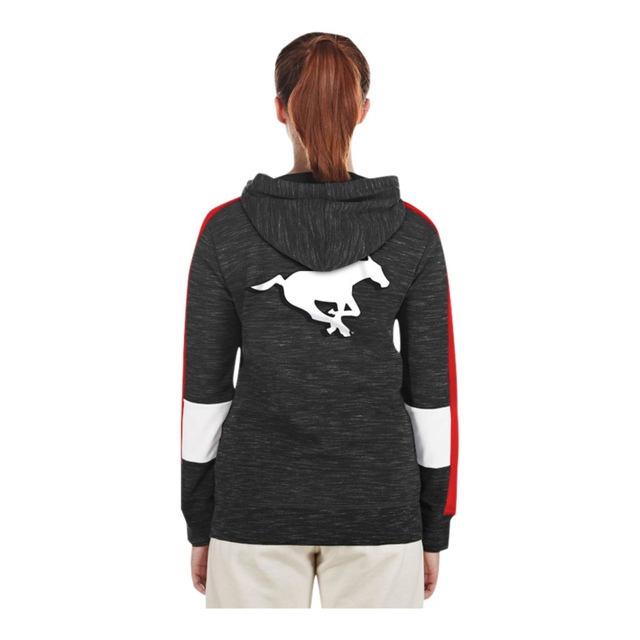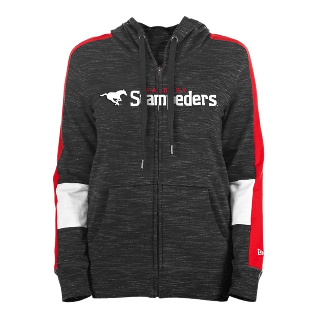 Calgary Stampeders women's CFL full-zip hooded sweatshirt. Team Color space-dye fabrication with secondary team color striping down the outside of sleeves. Stamps wordmark screened across the front chest, and large team primary logo screenprinted on the back.