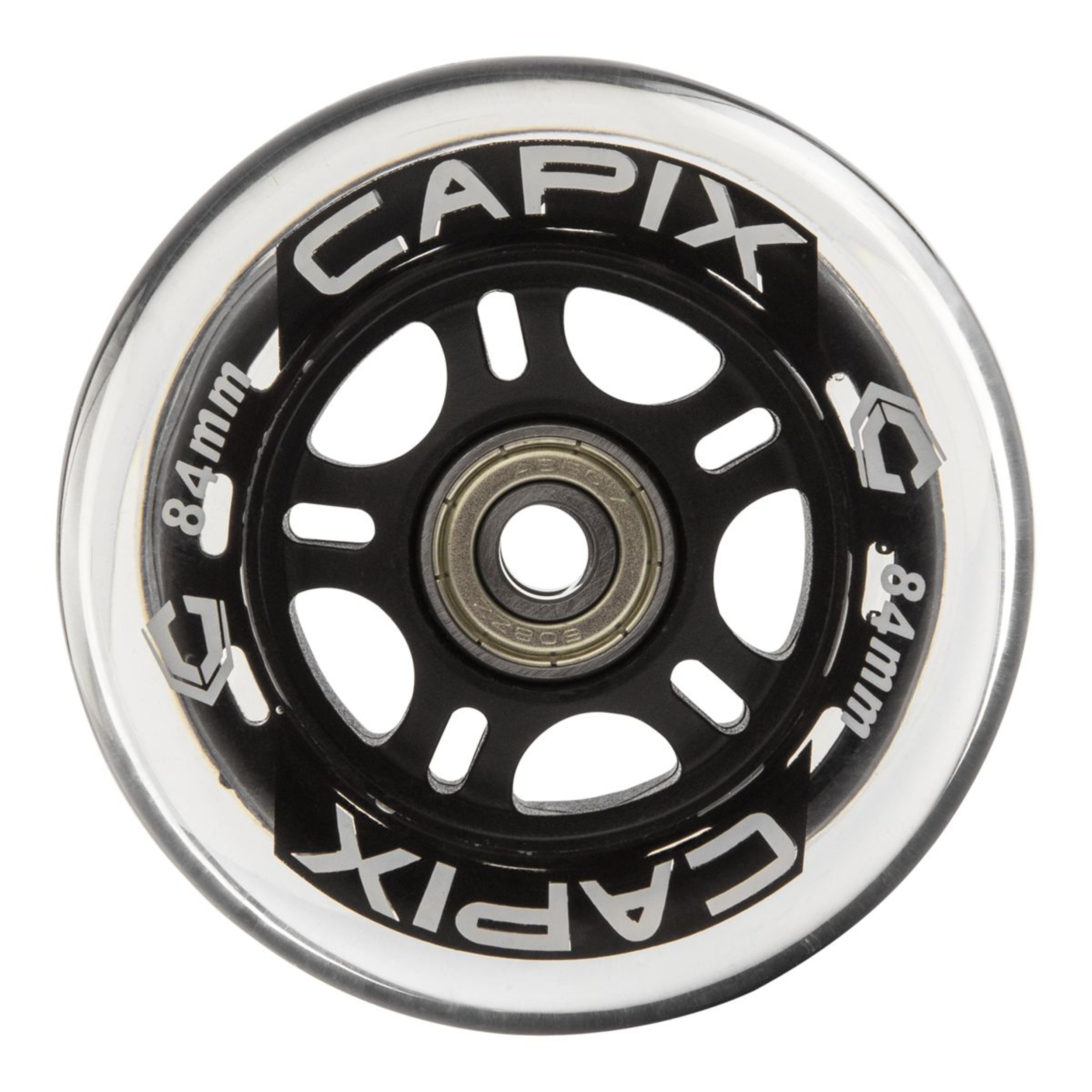 The Capix 84mm Replacement Wheels With ABEC 7 Bearings 2018 deliver a smooth, reliable ride on the skating rink. These premium inline skating wheels feature a large 84mm size with an 84A hardness rating for control and durability. The set includes ABEC 7 SG7 bearings for reduced friction and aluminum spacers for easy installation. This convenient 8-pack comes pre-assembled, making wheel replacement a breeze.