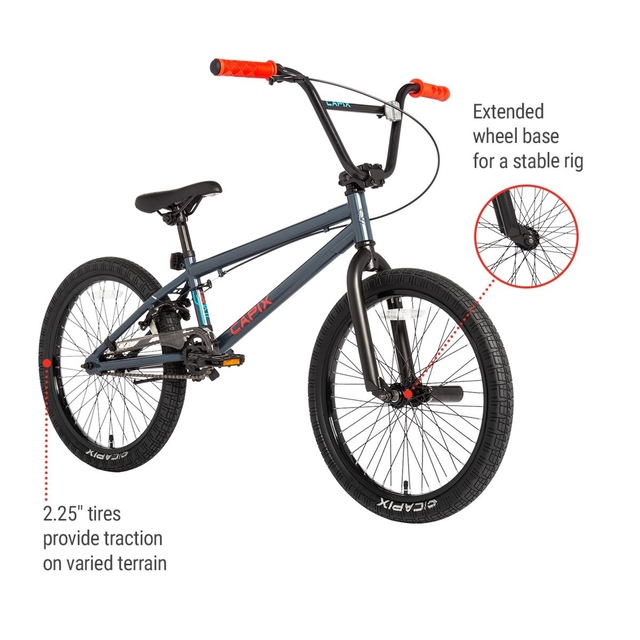 Conquer your local bike parks with ease using Capix Rail 20" BMX Bike featuring cutting-edge features. Enjoy the precision of our 3D forged stem, the comfort of micro-flanged Mason grips, and the stability of wide 2.25” tires. Experience enhanced braking performance with Capix’s sticky clear brake pads, designed with a softer rubber compound for better control and safety.