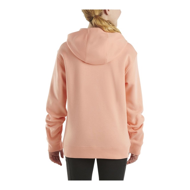 The Carhartt Kids' Logo Long Sleeve Hoodie is suitable for kids' work, school, or outdoor activities. Made from a cotton and polyester fleece blend, it offers warmth in cooler weather. Carhartt's Force technology ensures breathability and comfort in warmer conditions. Raglan sleeves provide mobility, while rib-knit cuffs and hem of this long-sleeved hoodie give a secure fit.