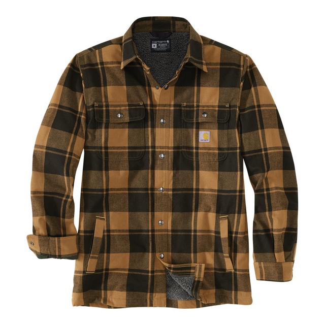 The Carhartt Men's Flannel Shirt Jacket is your go-to for reliable warmth and comfort, whether you're working hard or enjoying the outdoors. Crafted from durable flannel and lined with plush sherpa fleece, this jacket keeps you cozy in chilly conditions. The allows for easy movement, and the spread collar adds a touch of classic style. With long sleeves, button cuffs, and three pockets, this shirt jacket combines rugged style with practical features.